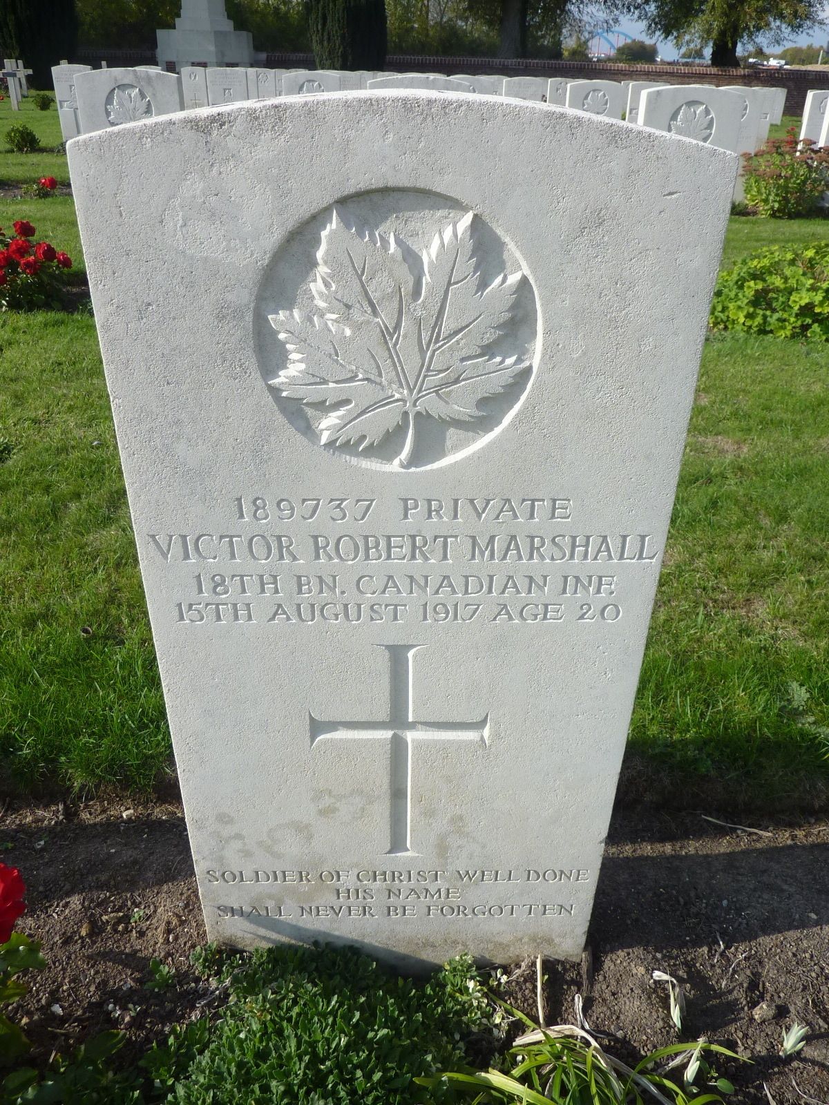 Family Search: When Private Victor Robert Marshall was born on 12 July 1897, in Stockport, Greater Manchester, England, United Kingdom, his father, William Marshall, was 26 and his mother, Amelia Sarah Lister, was 28. He immigrated to Canada in 1913 and lived in Chatham, Kent, Ontario, Canada in 1916. He registered for military service in 1916. In 1916, at the age of 19, his occupation is listed as butcher in Chatham, Kent, Ontario, Canada. He died on 15 August 1917, in Lens, Pas-de-Calais, France, at the age of 20, and was buried in Aix-Noulette, Pas-de-Calais, France.