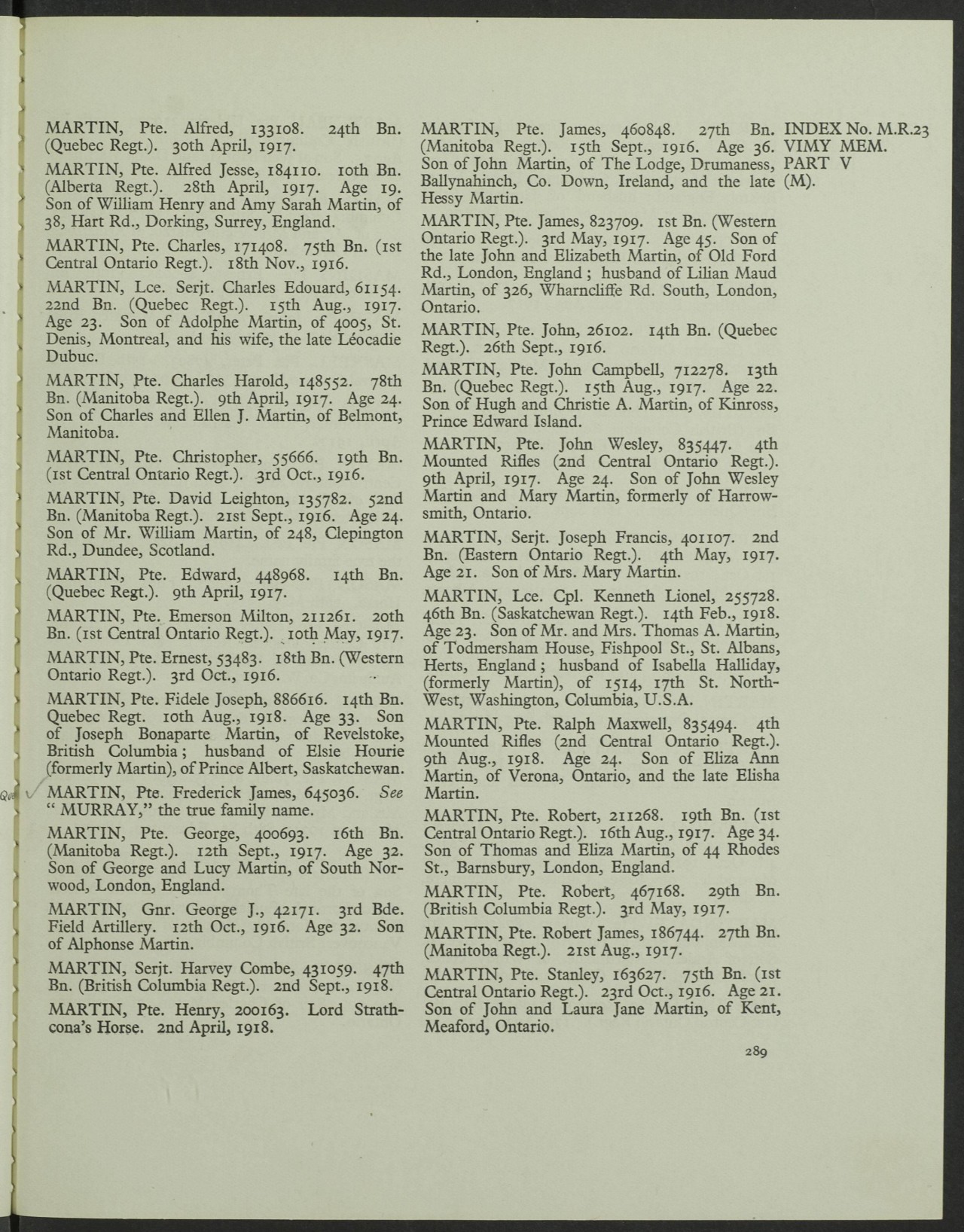 Family Search: When Private Ernest Martin was born on 12 September 1883, in Wexcombe, Wiltshire, England, United Kingdom, his father, James Martin, was 41 and his mother, Elizabeth Mason, was 21. He immigrated to Canada in 1914 and lived in Berkshire, England, United Kingdom in 1891 and Ingersoll, Oxford, Ontario, Canada in 1914. He registered for military service in 1914. In 1914, at the age of 31, his occupation is listed as farmer in Ingersoll, Oxford, Ontario, Canada. He died on 3 October 1916, in Courcelette, Somme, Picardie, France, at the age of 33, and was buried in Vimy, Pas-de-Calais, Nord-Pas-de-Calais, France.