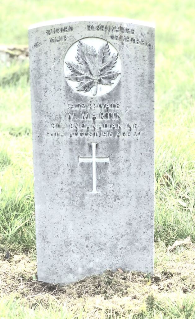 Family Search: Private William Martin was born on 12 February 1888, in Belfast, Ireland as the son of Francis Martin and Lucy. He immigrated to Canada in 1914. He registered for military service in 1915. In 1914, at the age of 26, his occupation is listed as butcher. He died on 26 August 1916, in Glasgow, Scotland, United Kingdom, at the age of 28, and was buried in Balmoral Cemetery, Belfast, Northern Ireland, United Kingdom.