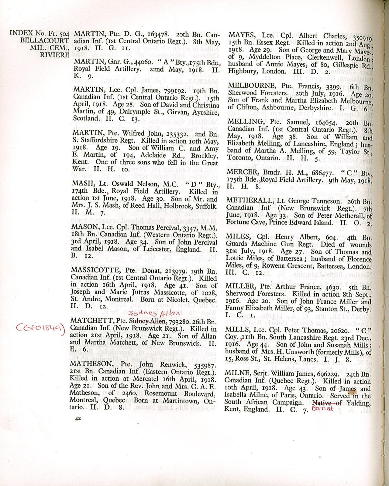 Family Search: When Lance-Corporal Thomas Percival Mason was born on 5 March 1884, in Leicestershire, England, United Kingdom, his father, John Percival Mason, was 36 and his mother, Isabel, was 34. He immigrated to Canada in 1913. He registered for military service in 1915. In 1915, at the age of 31, his occupation is listed as butcher. He died on 3 April 1918, in Neuville-Vitasse, Pas-de-Calais, France, at the age of 34, and was buried in Bellacourt Military Cemetery, Rivière, Pas-de-Calais, France