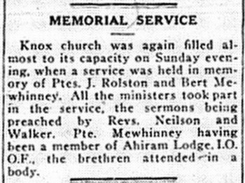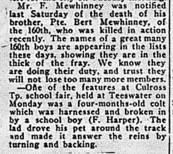 Note that this soldier is referred to with the spelling of his last name as “Mewhinney” consistently in the news clippings of the time.