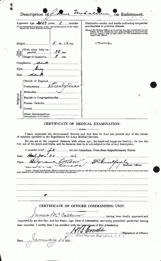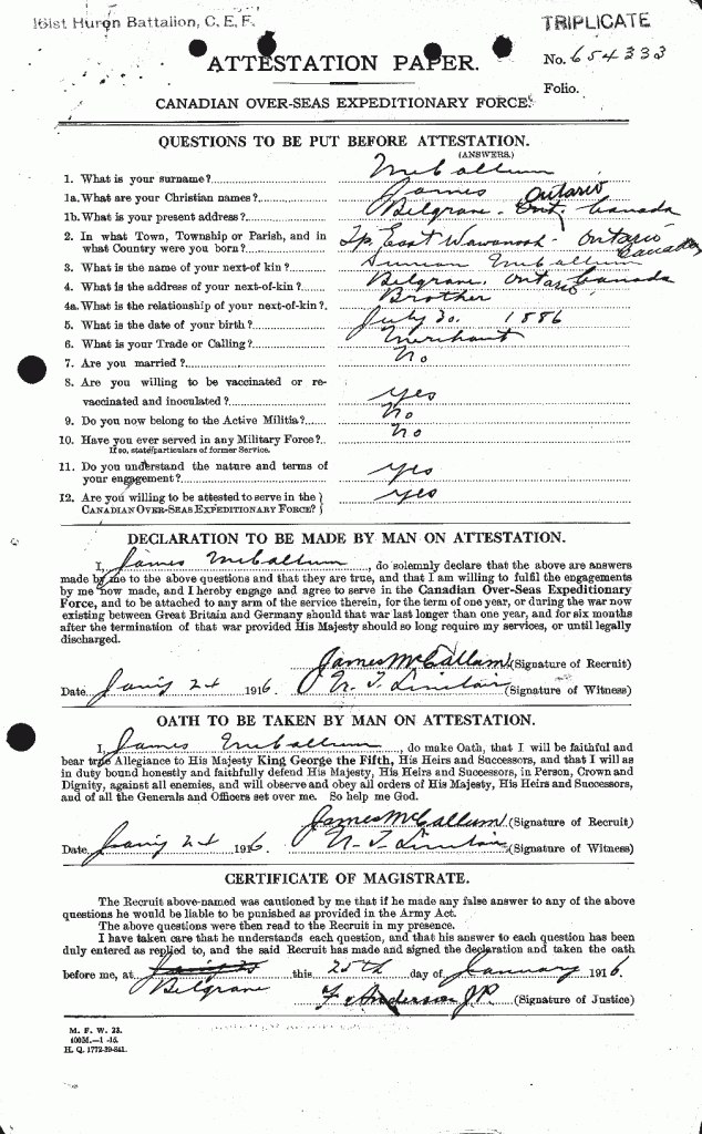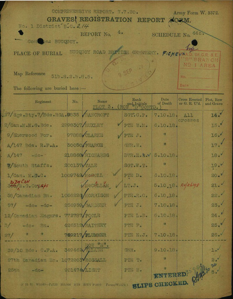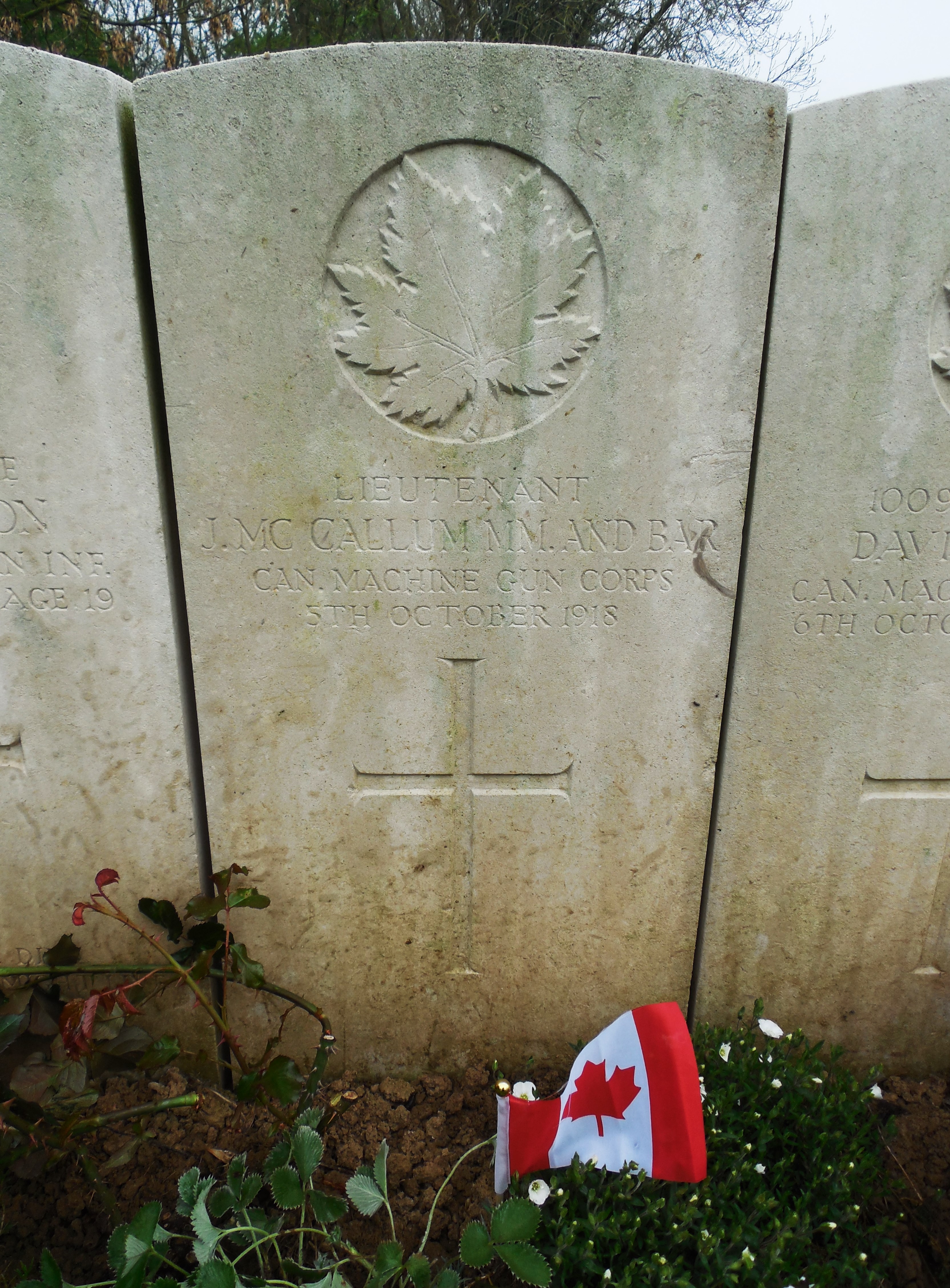 Family Search: When James McCallum was born on 30 July 1886, in Huron, Ontario, Canada, his father, James McCallum, was 55 and his mother, Sarah Ann Mclean, was 29. He lived in Belgrave, Morris-Turnberry, Huron, Ontario, Canada in 1916. He registered for military service in 1916. In 1916, at the age of 30, his occupation is listed as hardware man in Belgrave, Morris-Turnberry, Huron, Ontario, Canada. He died on 5 October 1918, in Ficheux, Pas-de-Calais, Nord-Pas-de-Calais, France, at the age of 32, and was buried in Bucquoy, Pas-de-Calais, Hauts-de-France, France.