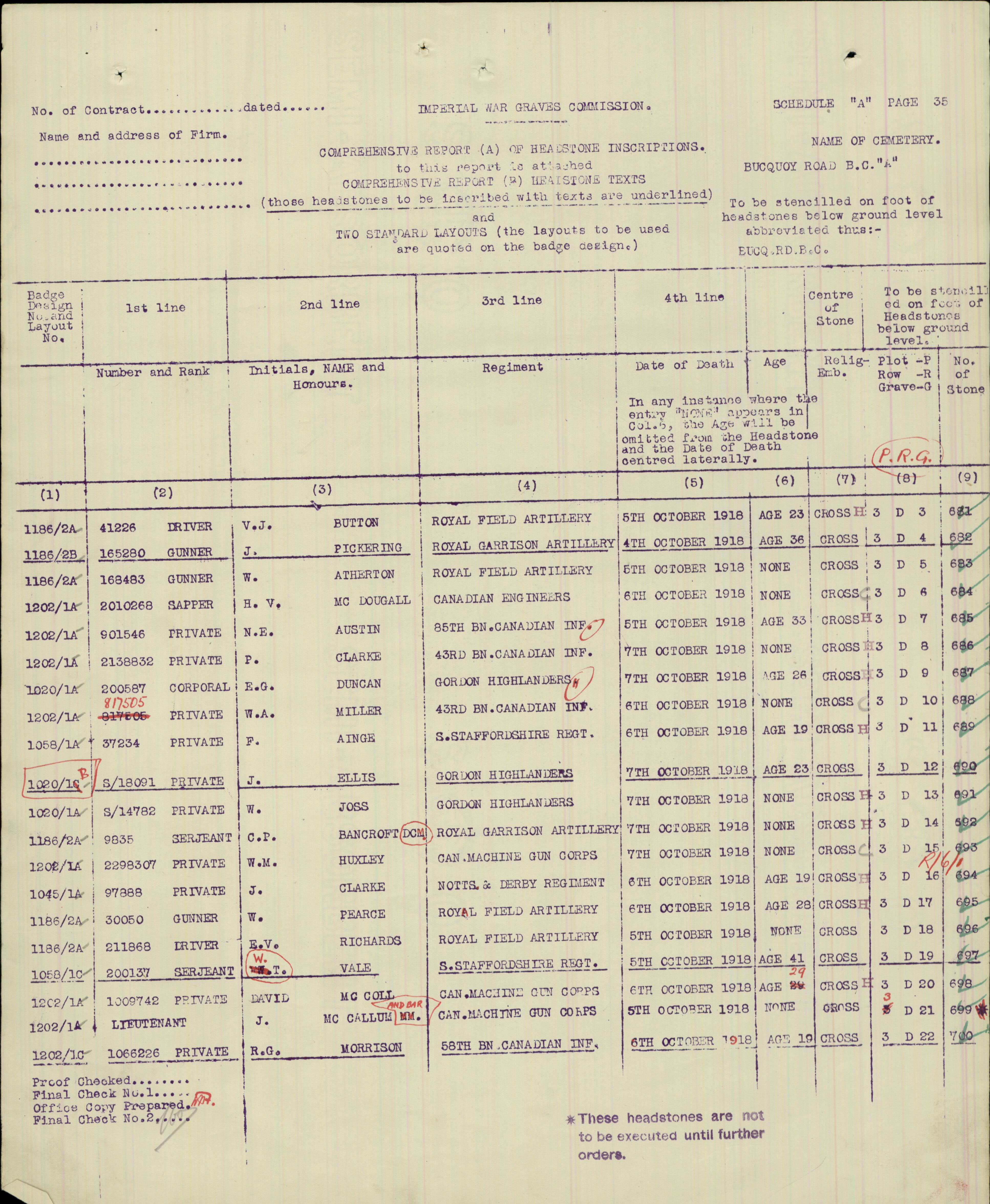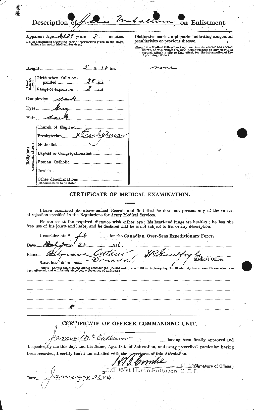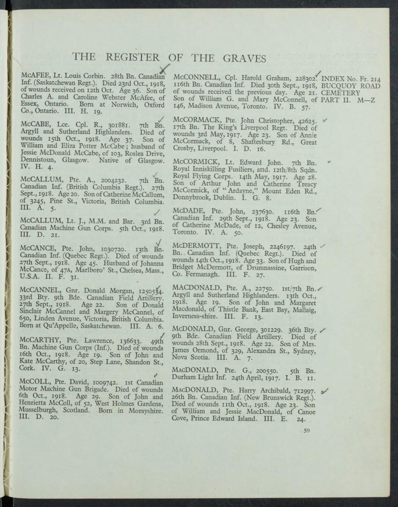 Family Search: When James McCallum was born on 30 July 1886, in Huron, Ontario, Canada, his father, James McCallum, was 55 and his mother, Sarah Ann Mclean, was 29. He lived in Belgrave, Morris-Turnberry, Huron, Ontario, Canada in 1916. He registered for military service in 1916. In 1916, at the age of 30, his occupation is listed as hardware man in Belgrave, Morris-Turnberry, Huron, Ontario, Canada. He died on 5 October 1918, in Ficheux, Pas-de-Calais, Nord-Pas-de-Calais, France, at the age of 32, and was buried in Bucquoy, Pas-de-Calais, Hauts-de-France, France.