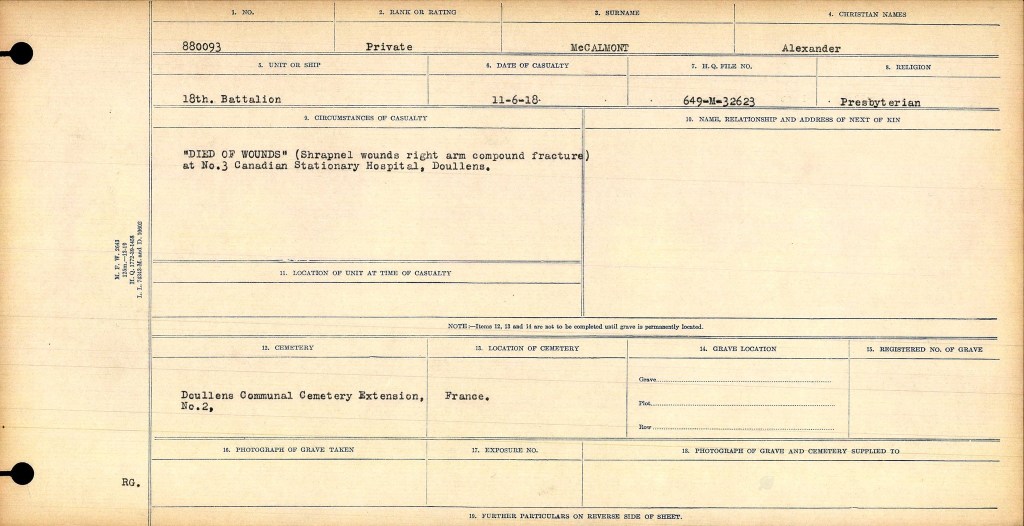 Family Search: When Private Alexander McCalmont was born on 1 September 1888, in County Antrim, Ireland, his father, Alexander or Sandy McCalmont, was 35 and his mother, Elizabeth Jane Colville, was 37. He married Rosanna McManus on 30 April 1909, in Kent, British Columbia, Canada. They were the parents of at least 1 son and 2 daughters. He immigrated to Quebec City, Quebec, Canada in 1906 and lived in Ballymoney, Islandmagee, County Antrim, Ireland in 1901. He registered for military service in 1916. In 1916, at the age of 28, his occupation is listed as labourer in Thamesville, Kent, Ontario, Canada. He died on 11 June 1918, in Doullens, Somme, France, at the age of 29, and was buried in Doullens Communal Cemetery, Doullens, Somme, France.