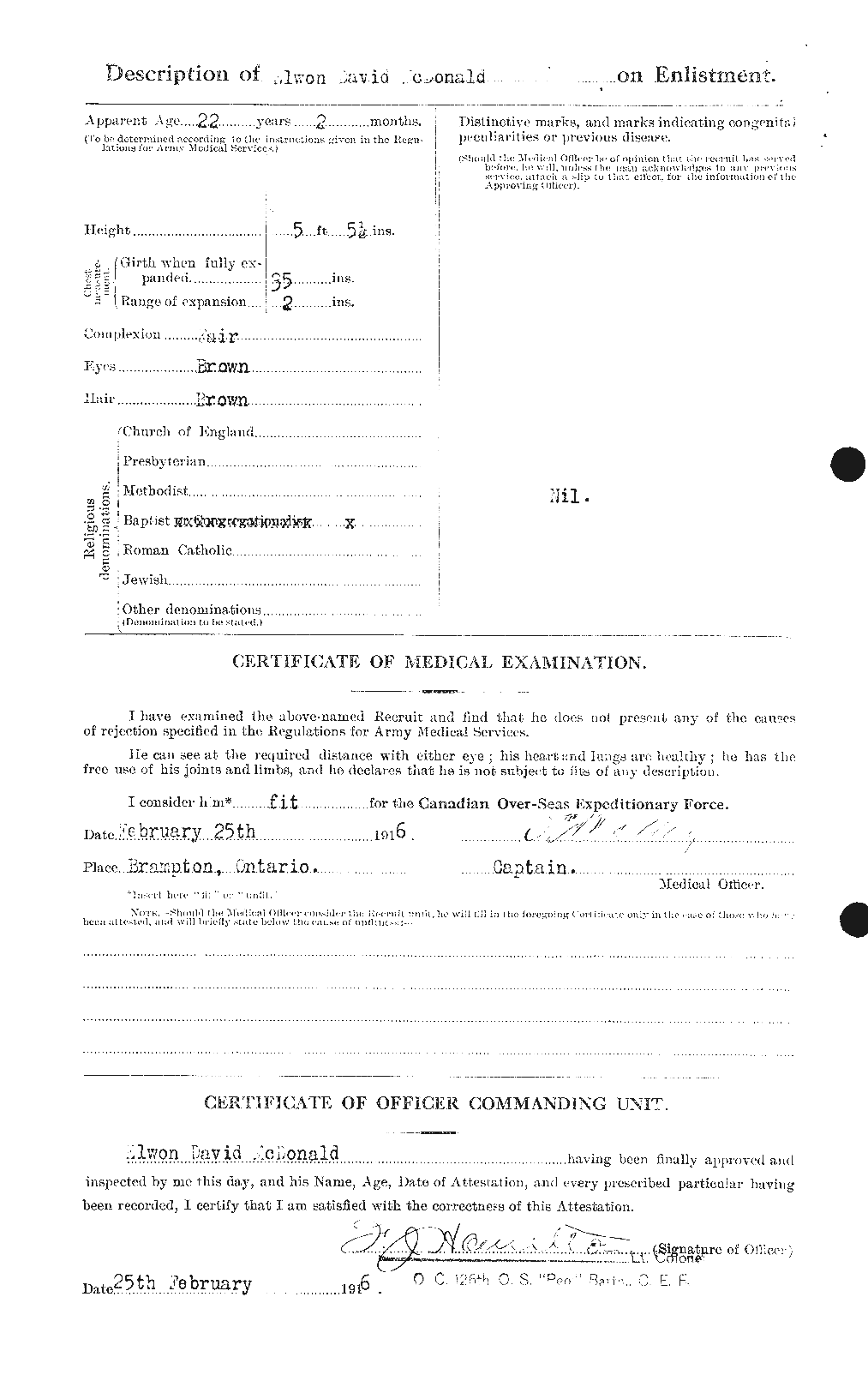 Photo of Elwon David McDonald – Caption (pg. 378): SOLDIERS OF PEEL WHO LOST THEIR LIVES DURING THE GREAT WAR. Author – William Perkins Bull. “From Brock to Currie: the military development and exploits of Canadians in general and of the men of Peel in particular, 1791 to 1930.” Toronto, 1935. Source: CVWM