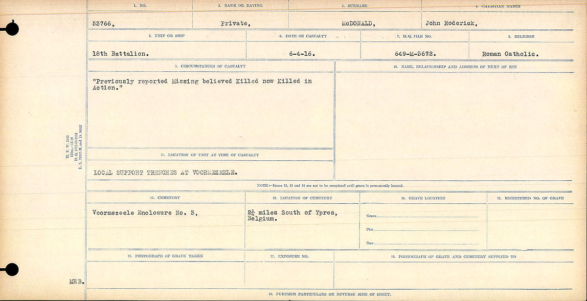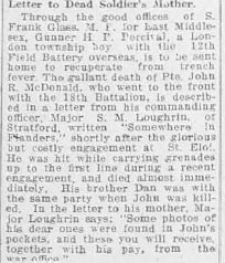 Stratford, April 22 – A first-had Tribute to the gallantry and sacrifice of the men of the 18th Battalion in their recent glorious but costly achievement at St. Eloi is to hand in a letter to Mr. and Mrs. J. Smith of 34 Inverness street, from Pte. J. Betts[i], their son-in-law, written in Belgium the day after the engagement began. In the battle at least three Stratford soldiers were killed – Pte. Leslie Rankin[ii], Pte. John R. McDonald and Pte. John Smith, besides several being wounded. Pte. Betts’ letter is a message of condolence to Mr. and Mrs. Smith in the loss of their son and the writer’s brother-in-law and it throws a touching light in the fortunes of the fighting 18th. It reads: