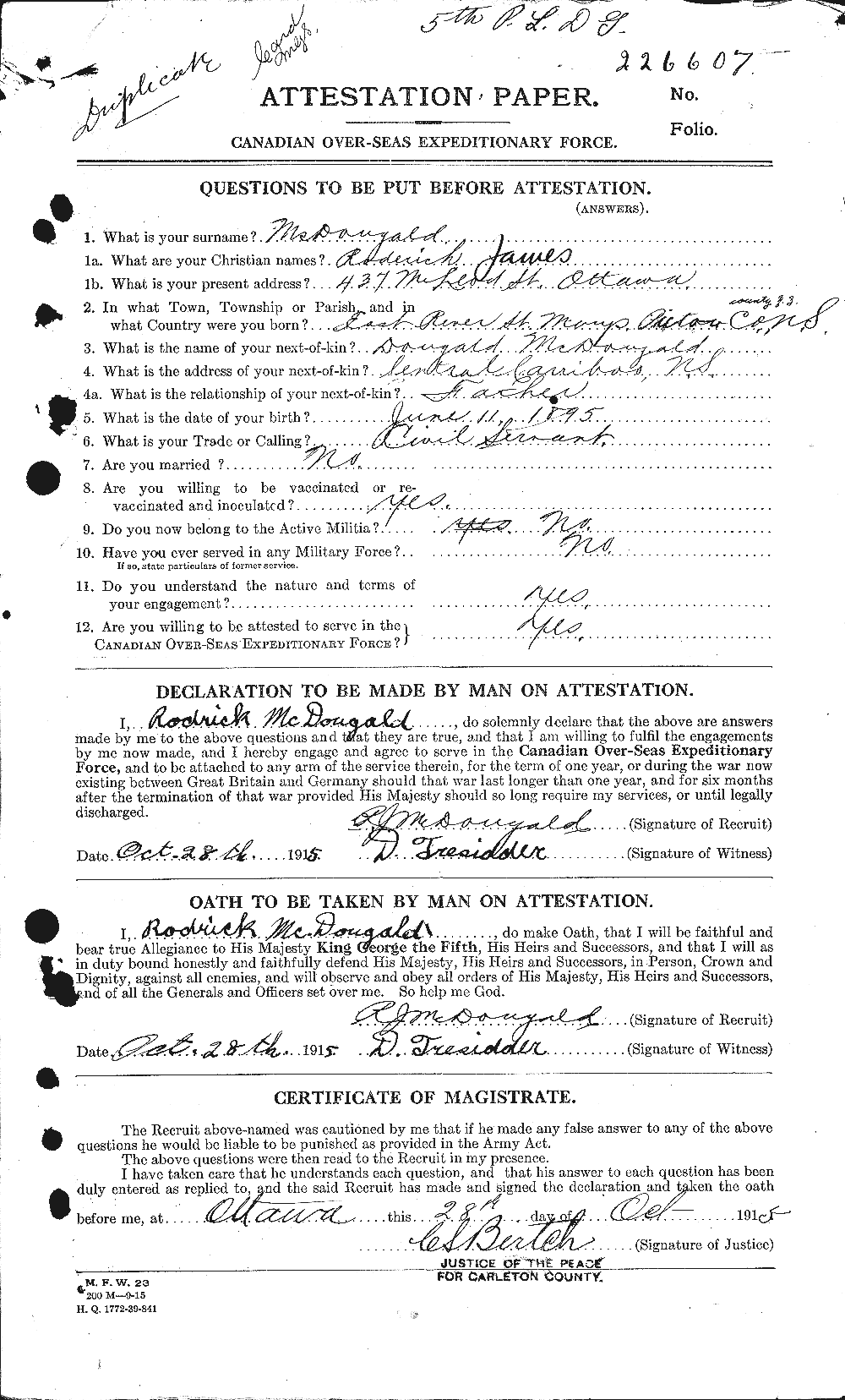 Family Search: When Private Roderick James McDougald was born on 11 June 1895, in Pictou, Nova Scotia, Canada, his father, Dougald McDougald J. R., was 33 and his mother, Jessie Mary Ross, was 26. He lived in Ottawa, Ontario, Canada in 1915. He registered for military service in 1915. In 1915, at the age of 20, his occupation is listed as civil servant, department of customs in Ottawa, Ontario, Canada. He died on 7 September 1917, in Chichester, West Sussex, England, United Kingdom, at the age of 22, and was buried in Chichester, West Sussex, England, United Kingdom.