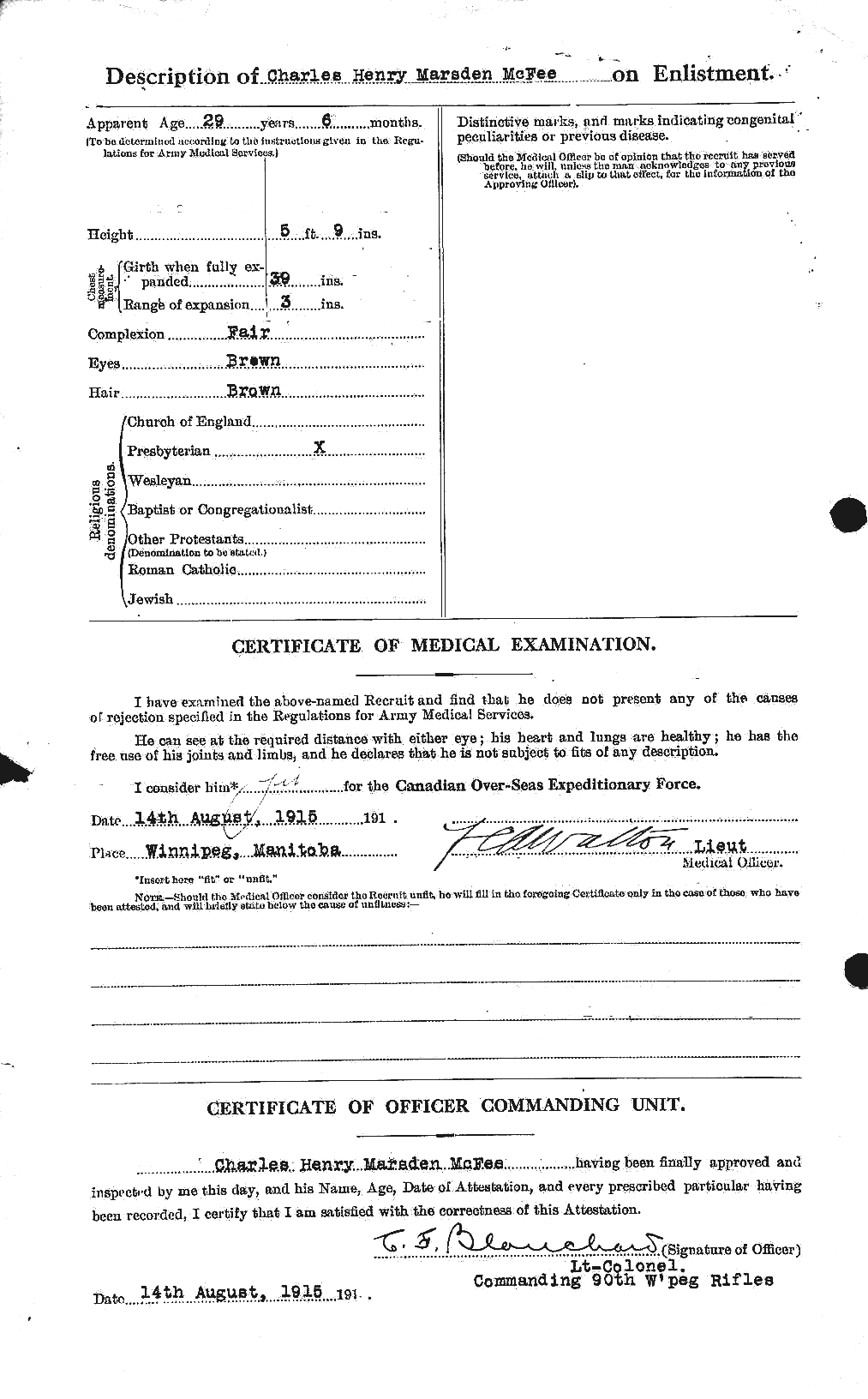 He enlisted in Winnipeg, Manitoba on 14th August 1915, giving his date of birth as 13th February 1886, a waiter born in London, living with his wife Louisa R.F. McFEE at 546 Rathgar Avenue, Winnipeg. He was 5 feet 9 inches (175.3 cm) tall, chest 36″ to 39″ (91.4 to 99.1 cm), brown eyes and hair, Presbyterian.