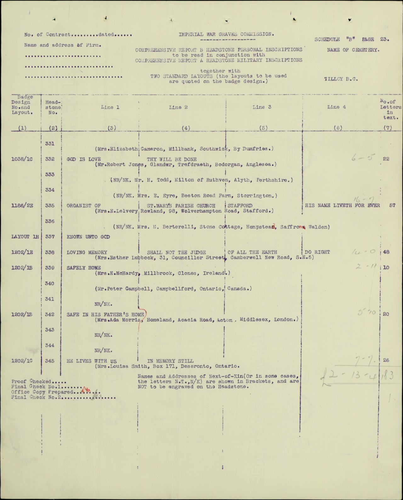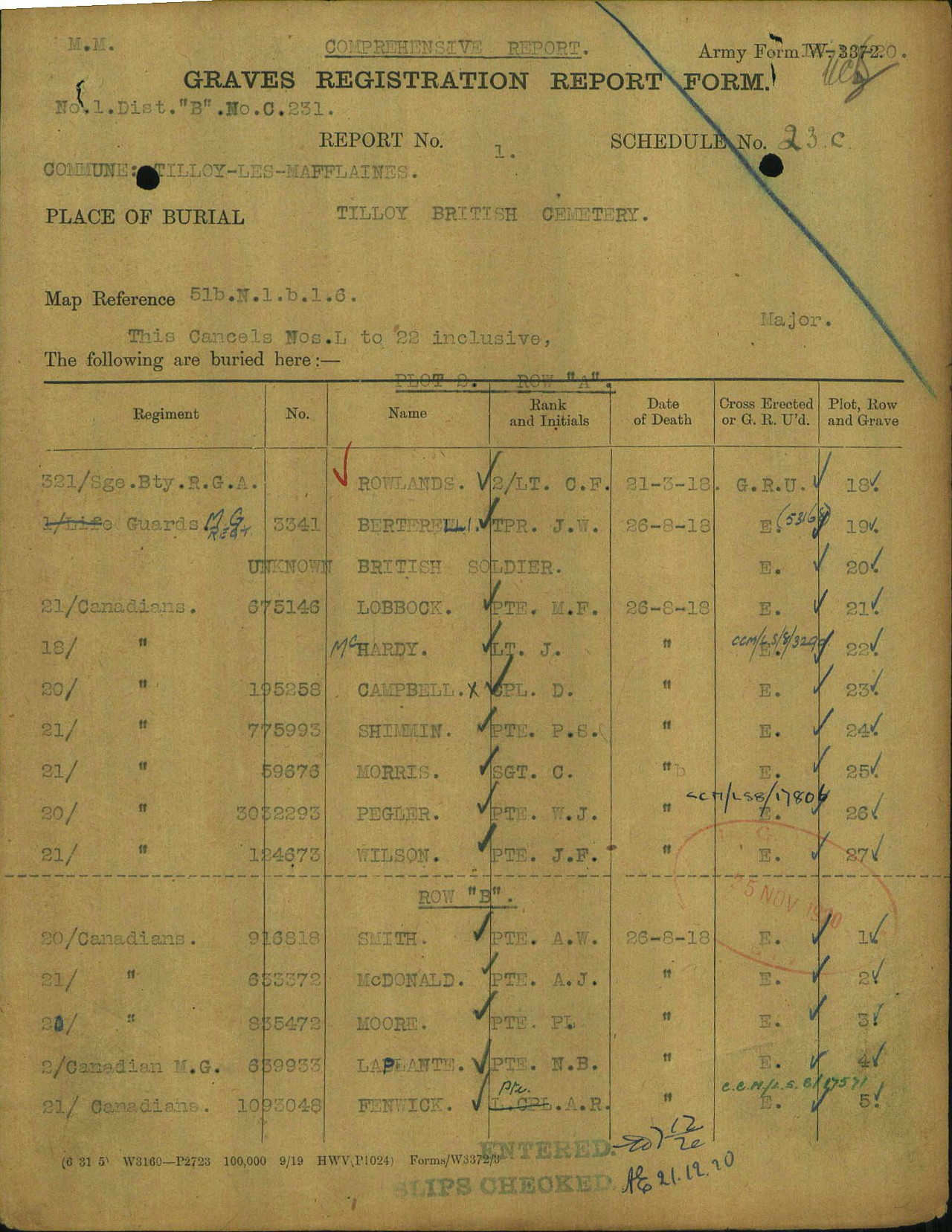 This soldier was a 26-year old watchmaker who enlisted at St. Thomas, Ontario January 13, 1915. He was originally assigned to the 9th Battalion and was posted as a Temporary Lieutenant on November 21, 1916. On December 2, 1916, he was posted for duty with the 18th Battalion and arrived with the Battalion on December 7, 1916, in France. He served with the Battalion until wounded on December 27, 1916. He returned to England for treatment and proceeded to France when recovered to serve with the Battalion, arriving September 9, 1917. He received two 14-day leaves in the intervening time and returned from his last leave in July 1918. He served with the Battalion until receiving mortal wounds on August 26, 1918, dying of them the same day.
