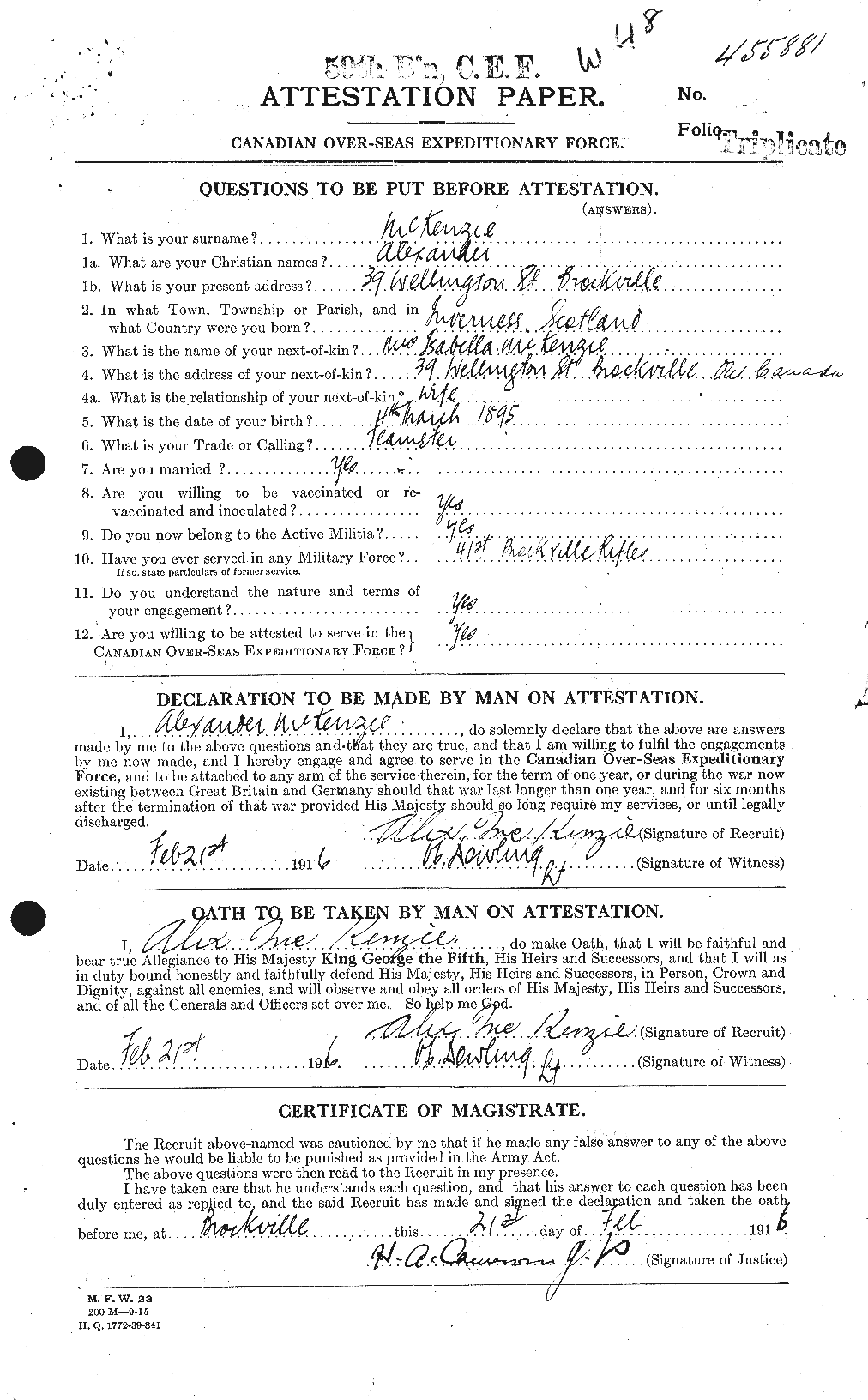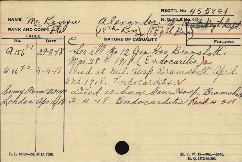 McKenzie, Alexander: Service no. 455881 CVWM Page Digitized Service Record CWGC Page Source: April 1918 casualty. Find-A-Grave Died of endocarditis at the 12 Canadian General Hospital, Bramshott, England. Don Knibbs via Find-A-Grave. Share this: Click to email a link to a friend (Opens in new window) Email Click to share on Facebook (Opens in new window) Facebook Click to share on X (Opens in new window) X Click to share on Reddit (Opens in new window) Reddit Click to share on LinkedIn (Opens in new window) LinkedIn Click to print (Opens in new window) Print Click to share on Tumblr (Opens in new window) Tumblr Click to share on Pocket (Opens in new window) Pocket Click to share on Pinterest (Opens in new window) Pinterest Click to share on Telegram (Opens in new window) Telegram Click to share on WhatsApp (Opens in new window) WhatsApp Like Loading...