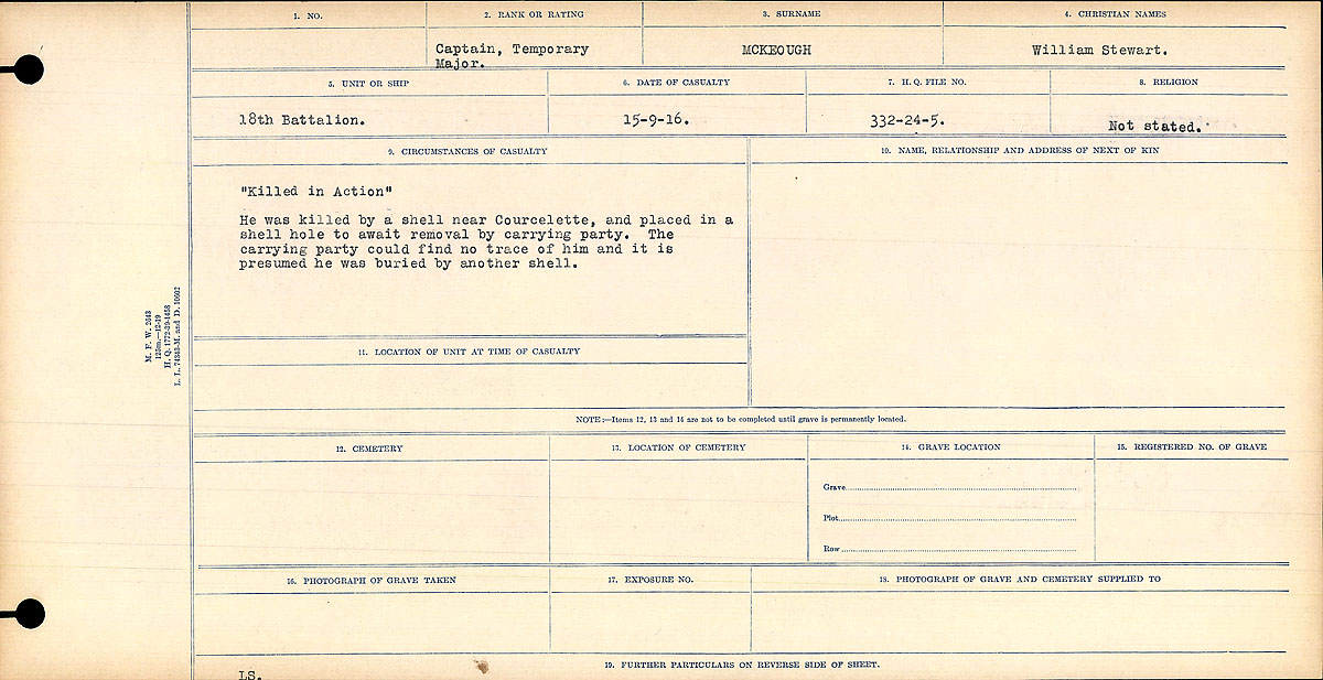 “Son of W. E. and M. A. McKeough, of 371, King St. West, Chatham, Ontario. b.Chatham; ed. McKeough P.S. and Chatham C.I.; University College 1910-1912, Medicine 1912-1914; Delta Kappa Epsilon; Manager,Third hockey team; Medical Athletic executive; Track team 1912-1914, First colours and captain 1914; Intercollegiate high jump record; Athletic directorate 1914-15; 24th Regt.,Lieut. In the fall of 1914 he was appointed to the 18th Battalion and went overseas in April,1915. Reaching France in September he served through the autumn and winter on the front south of Ypres. He was promoted captain in January,1916, and Major in July. At St.Eloi he distinguished himself by his bravery in bringing in the wounded after the unsuccessful attack on Crater 3. On the morning of the battle of Courcelette his battalion, despite heavy casualties, took part in the capture of the Sugar Refinery, and he was killed in action as he reached the German parapet when leading his company in the attack.”