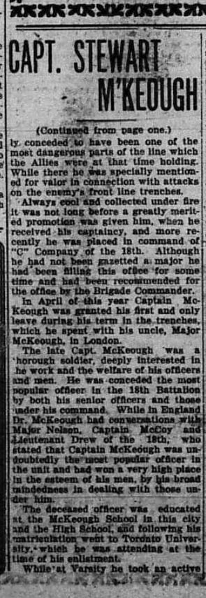 Son of W.E. McKeough; b. Chatham; ed. McKeough P.S. and Chatham C.I.; University College 1910-12, Medicine 1912-14; Delta Kappa Epsilon; Manager Third Hockey team; Medical Athletic executive; Track team 1912-14, First colours and Captain 1914; Intercollegiate high jump record; Athletic directorate 1914-15; 24th Regt., Lieut.In the fall of 1914 he was appointed to the 18th Battalion, and went overseas in April 1915. Reaching France in September he served through the autumn and winter on the front south of Ypres. He was promoted Captain in January 1916 and Major in July. At St. Eloi he distinguished himself by his bravery in bringing in the wounded after the unsuccessful attack on Crater 3. On the morning of the battle of Courcelette his battalion, despite heavy casualties, took part in the capture of the Sugar Refinery, and he was killed in action as he reached the German parapet when leading his company in the attack.”