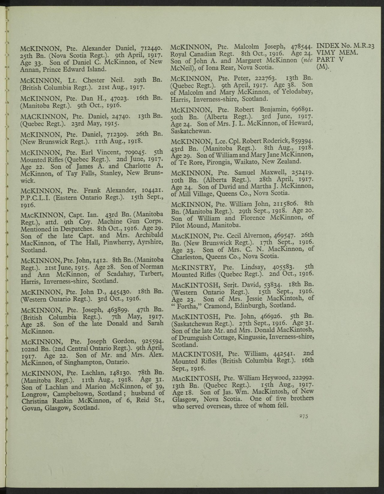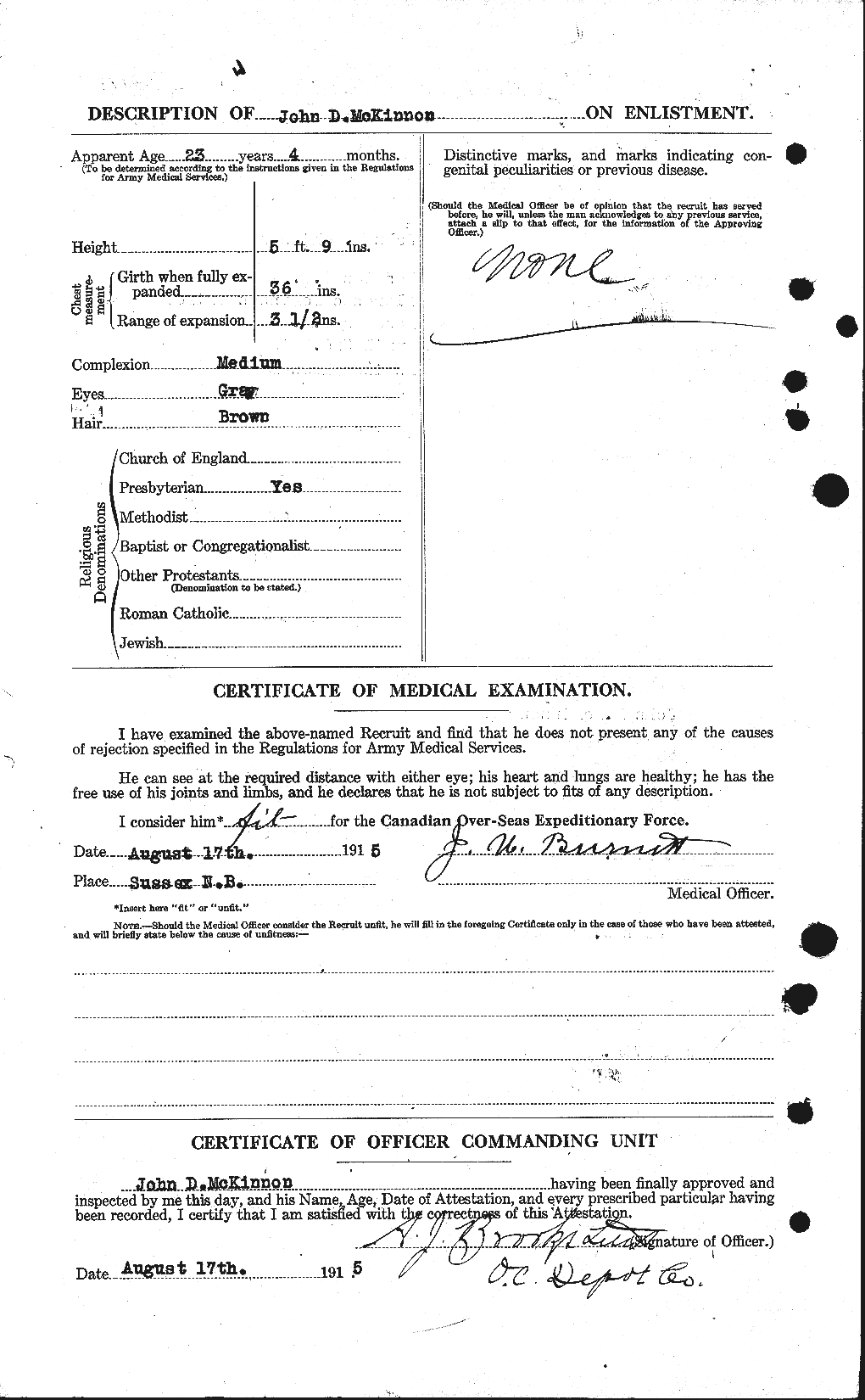 Family Search: When Private John Daniel McKinnon was born on 3 April 1892, in Scotch Settlement, Moncton, Westmorland, New Brunswick, Canada, his father, Malcolm B MacKinnon, was 36 and his mother, Mary Jane McQuarrie, was 29. He had at least 1 daughter with Florence Gallant. He lived in Grey, Ontario, Canada in 1911 and Westmorland, New Brunswick, Canada in 1911. He registered for military service in 1915. In 1915, at the age of 23, his occupation is listed as engine cleaner. He died on 3 October 1916, in Courcelette, Somme, France, at the age of 24, and was buried in Vimy, Pas-de-Calais, France.