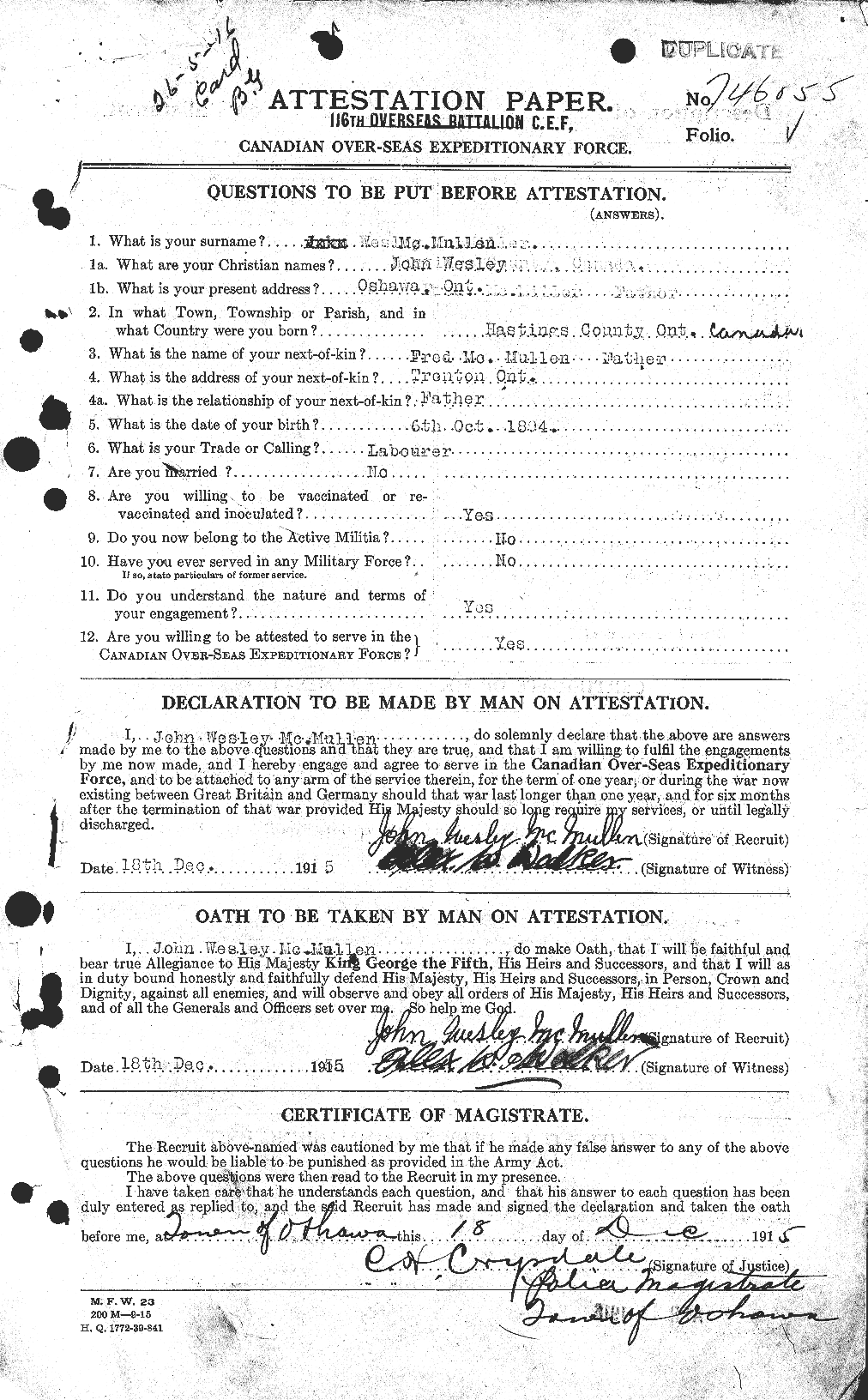 Family Search: When John Wesley McMullen was born on 6 October 1894, in Hastings, Ontario, Canada, his father, Frederick Hiram McMullen, was 28 and his mother, Phoebe Susan Wannamaker, was 28. He lived in Oshawa, Durham, Ontario, Canada in 1915. He registered for military service in 1915. In 1915, at the age of 21, his occupation is listed as labourer in Oshawa, Durham, Ontario, Canada. He died on 9 April 1917, in Thélus, Pas-de-Calais, Hauts-de-France, France, at the age of 22, and was buried in Thélus, Pas-de-Calais, Nord-Pas-de-Calais, France.