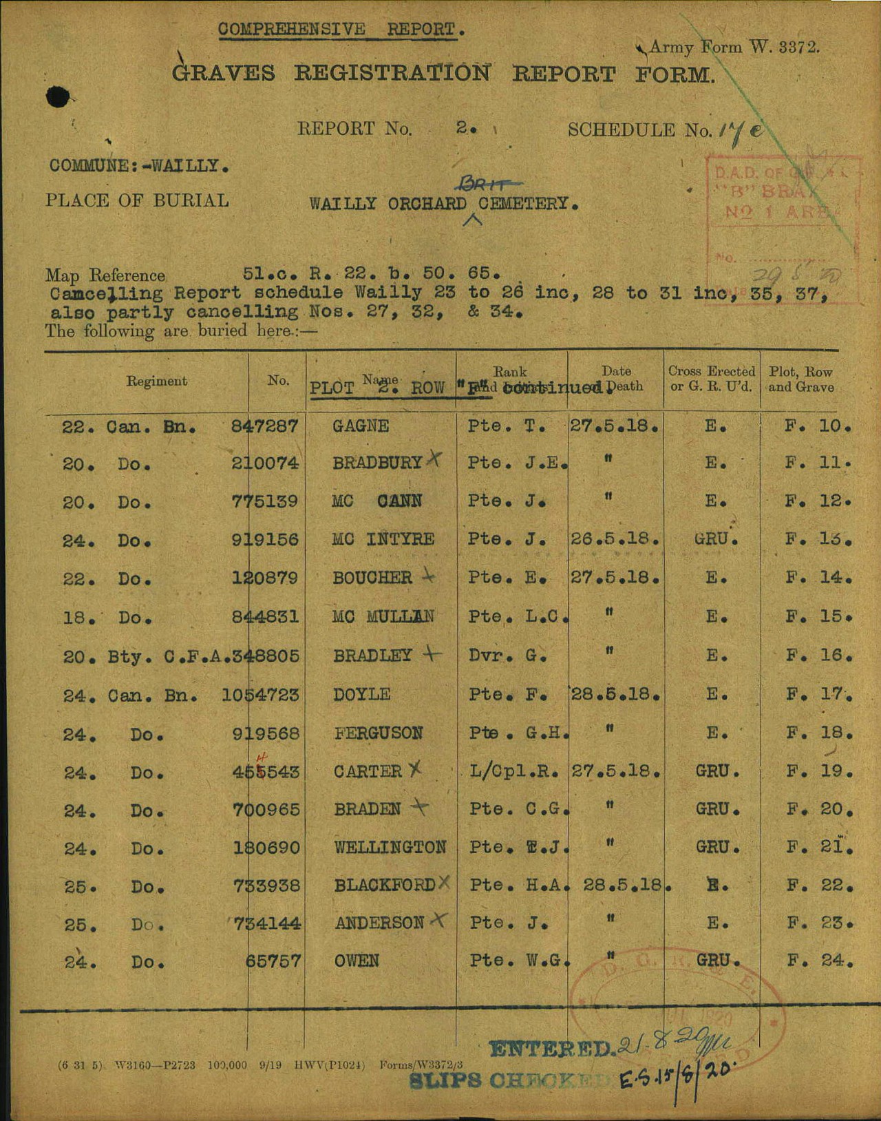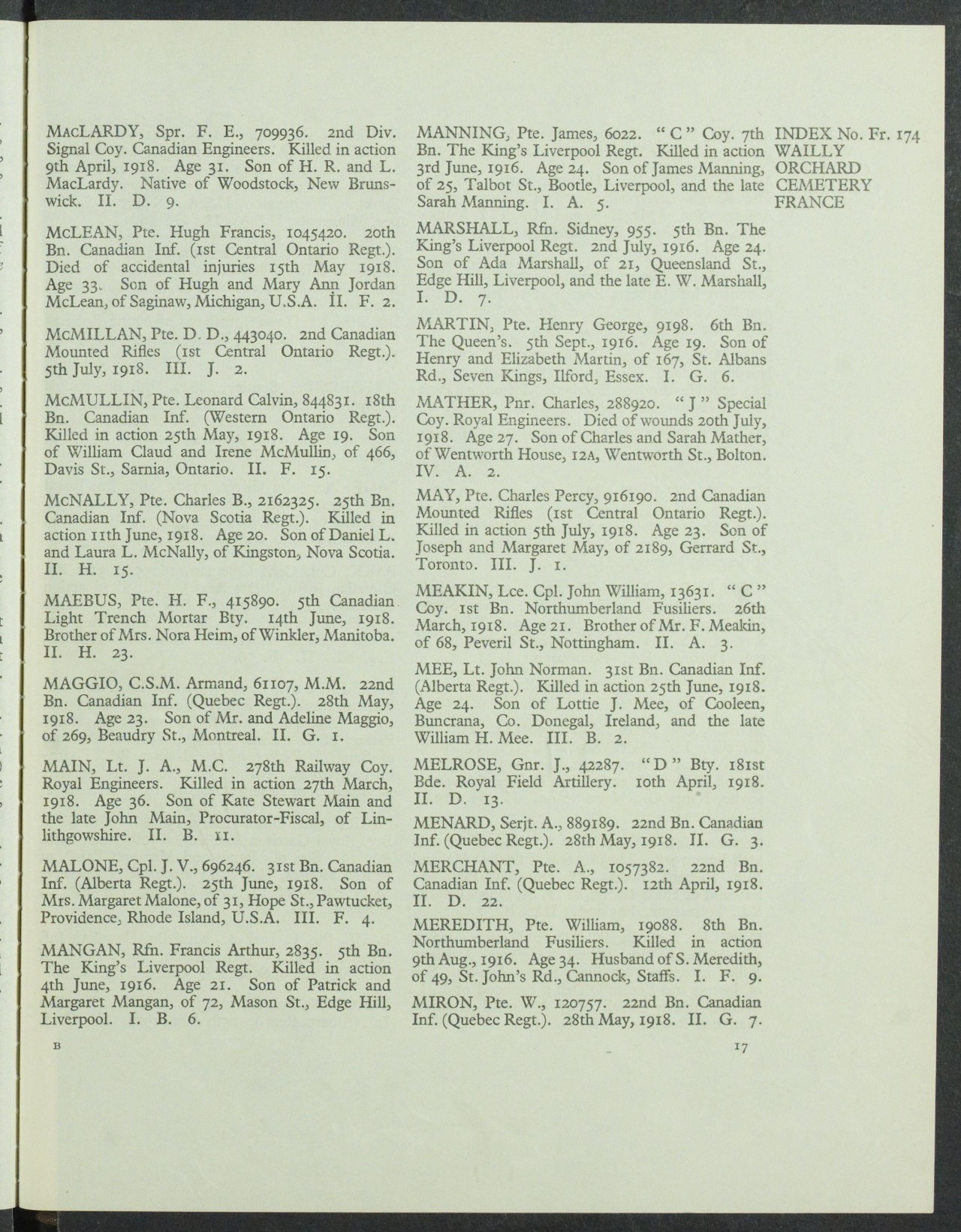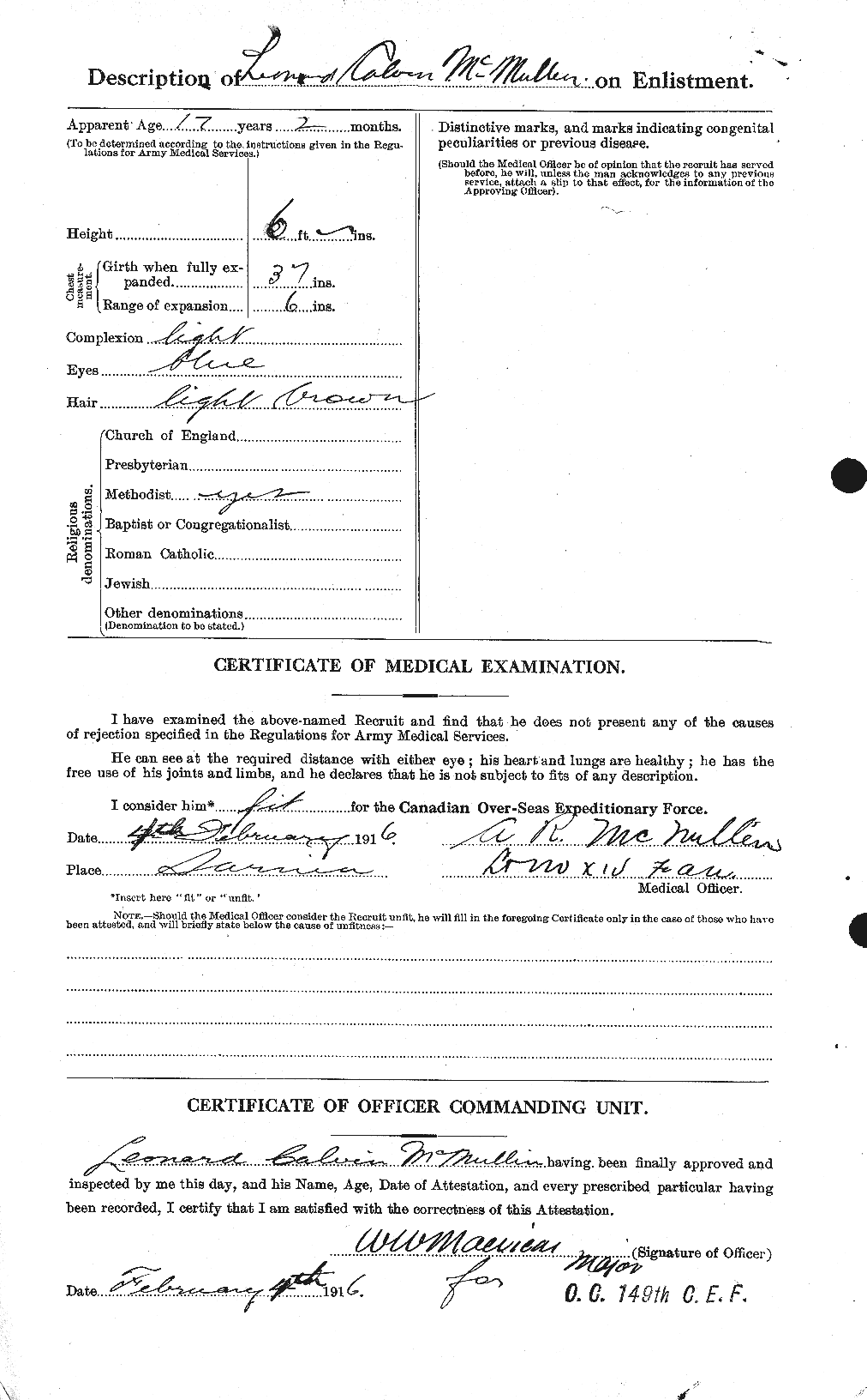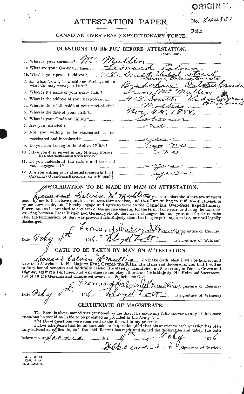 Enlisted with the 149th Battalon, on February 4th, 1916. Transferred to 18th Battalion. Killed in action at Arras, May 25th, 1918. Buried in Wailly Orchard Cemetery, Arras, France. Age 20 years. Pte. McMullen was a all-round athlete, also a great reader and musician. He was a popular member and willing working in all branches connected with the Devine St. Methodist Church, Sarnia.
