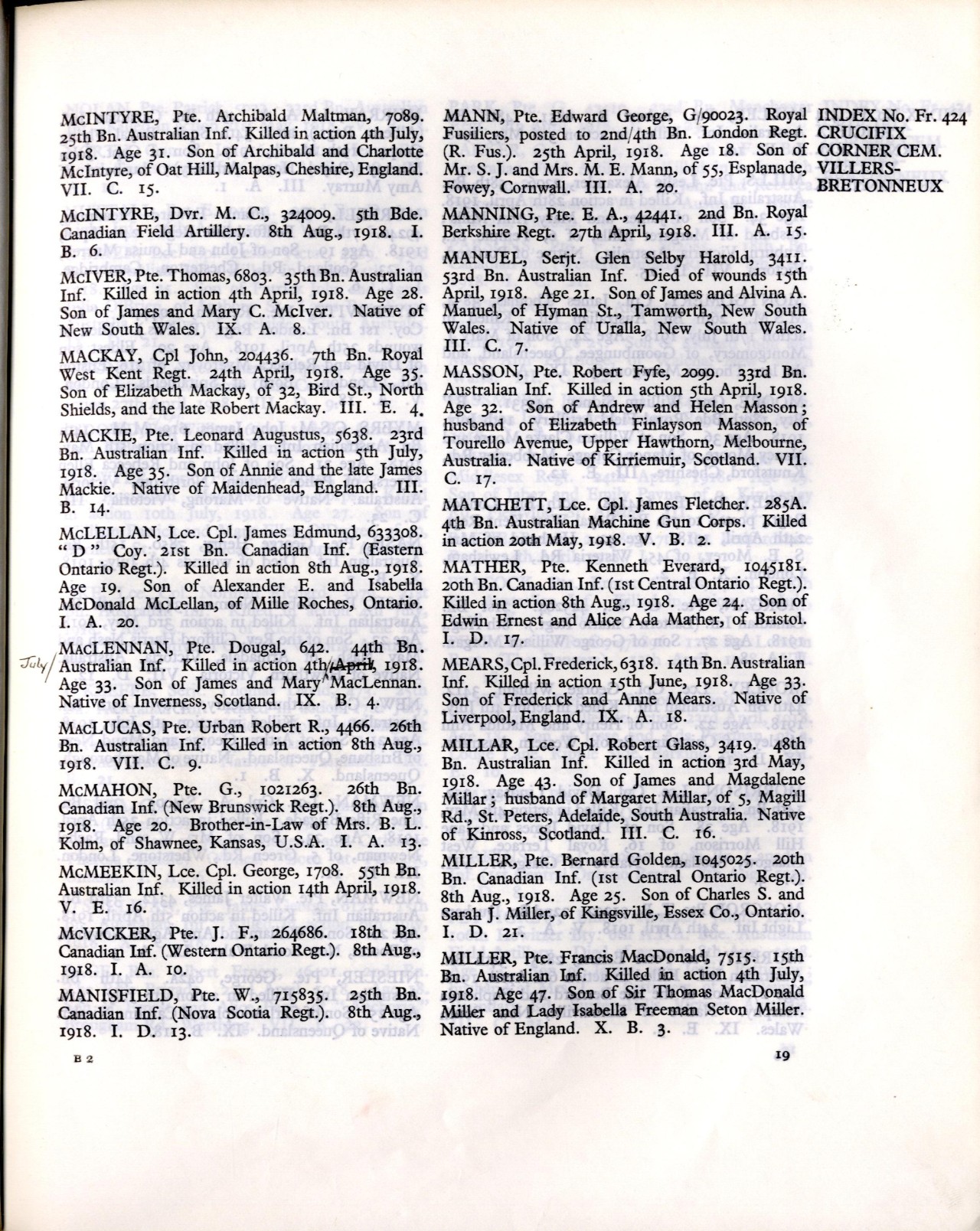 “Killed in Action.” Whilst taking part in the attack on Marcelcave in the morning of 8th August, 1918, he was hit in the breast and instantly killed by an enemy machine gun bullet.