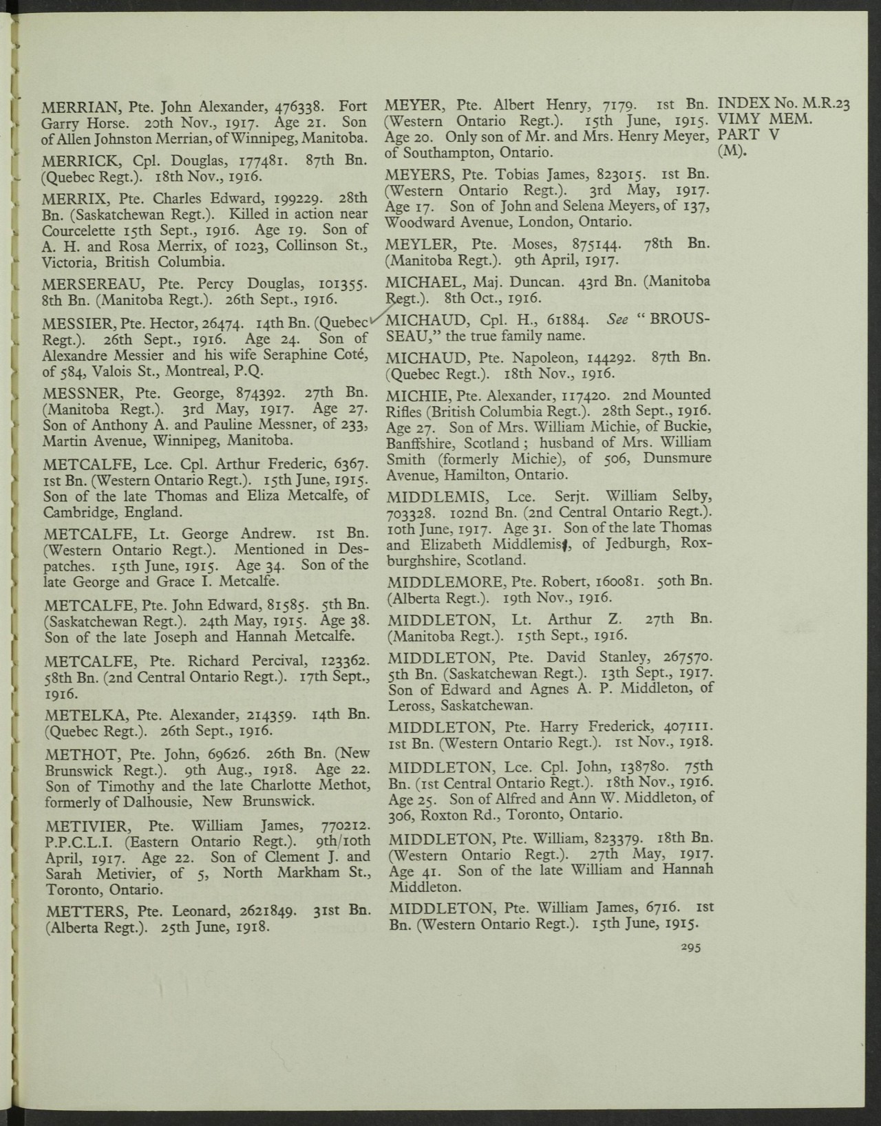 Inscription – His name as it is inscribed on the Vimy Memorial (2010). Over 11,000 fallen Canadians having no known place of burial in France, are honoured on this Memorial. May they never be forgotten. (J. Stephens). Source: CVWM