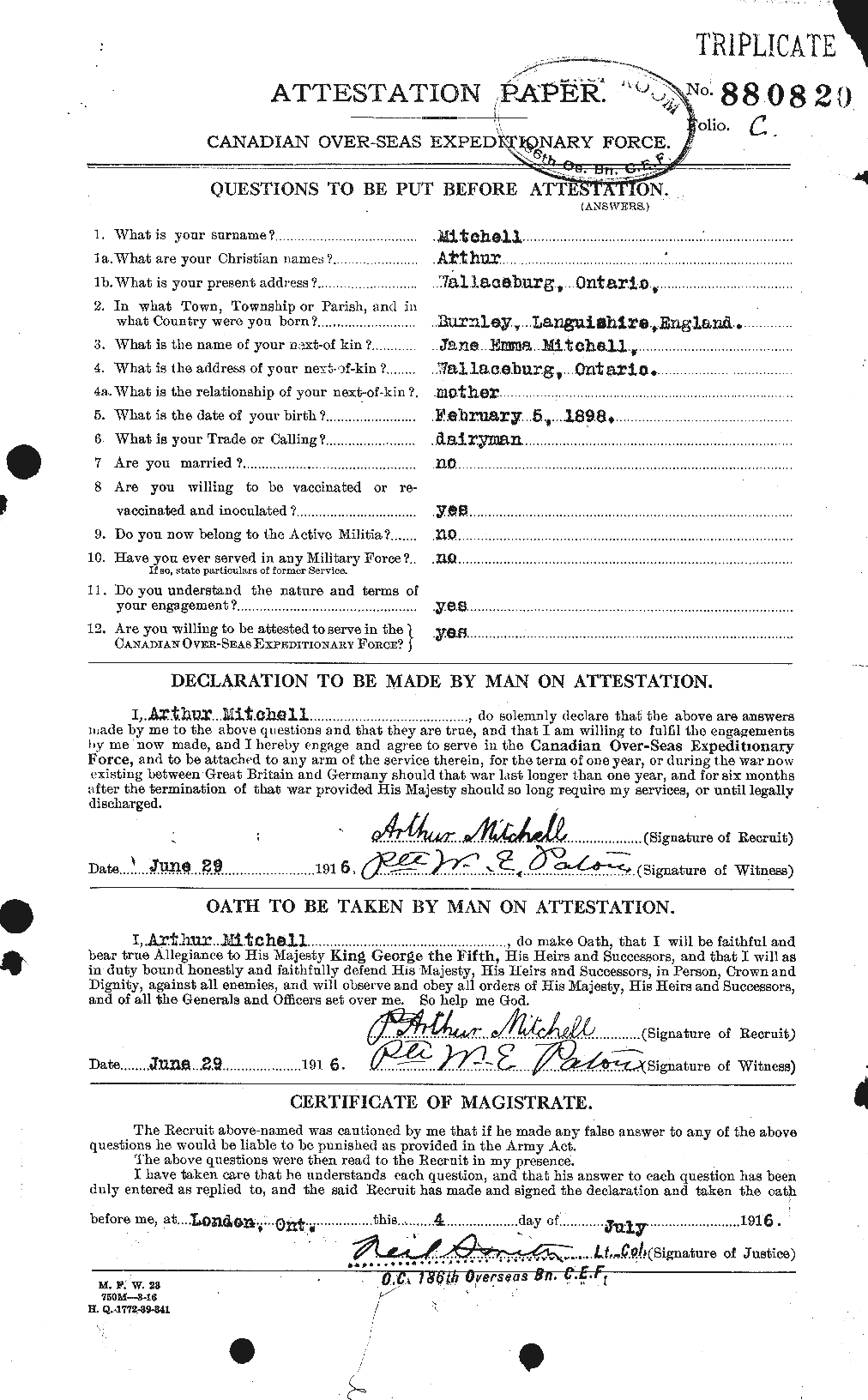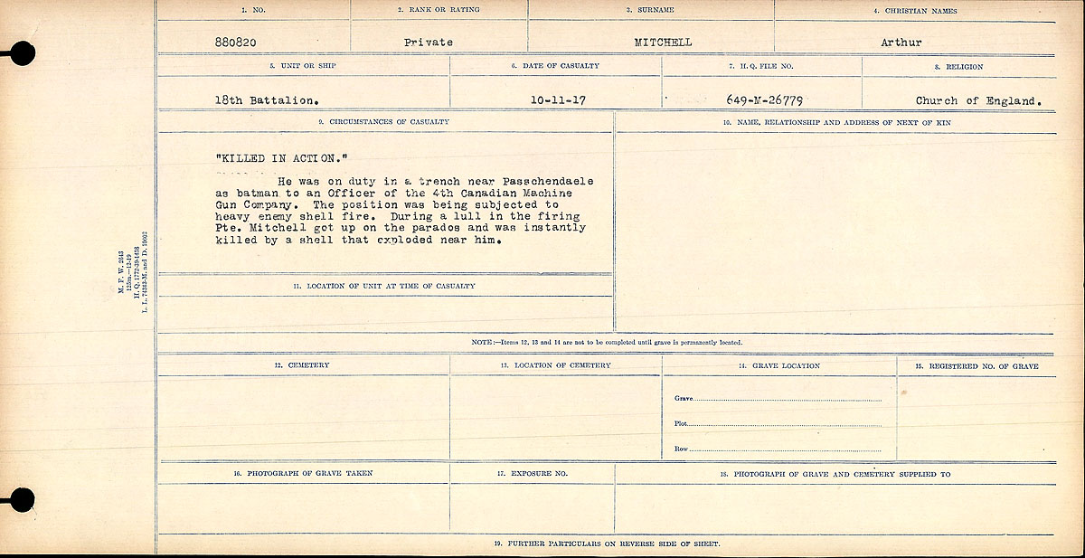 “Killed in Action” He was on duty in a trench near Passchendaele as batman to an Officer of the 4th Canadian Machine Gun Company. The position was being subjected to heavy enemy shell fire. During a lull in the firing Pte. Mitchell got up on the parados and was instantly killed by a shell that exploded near him.