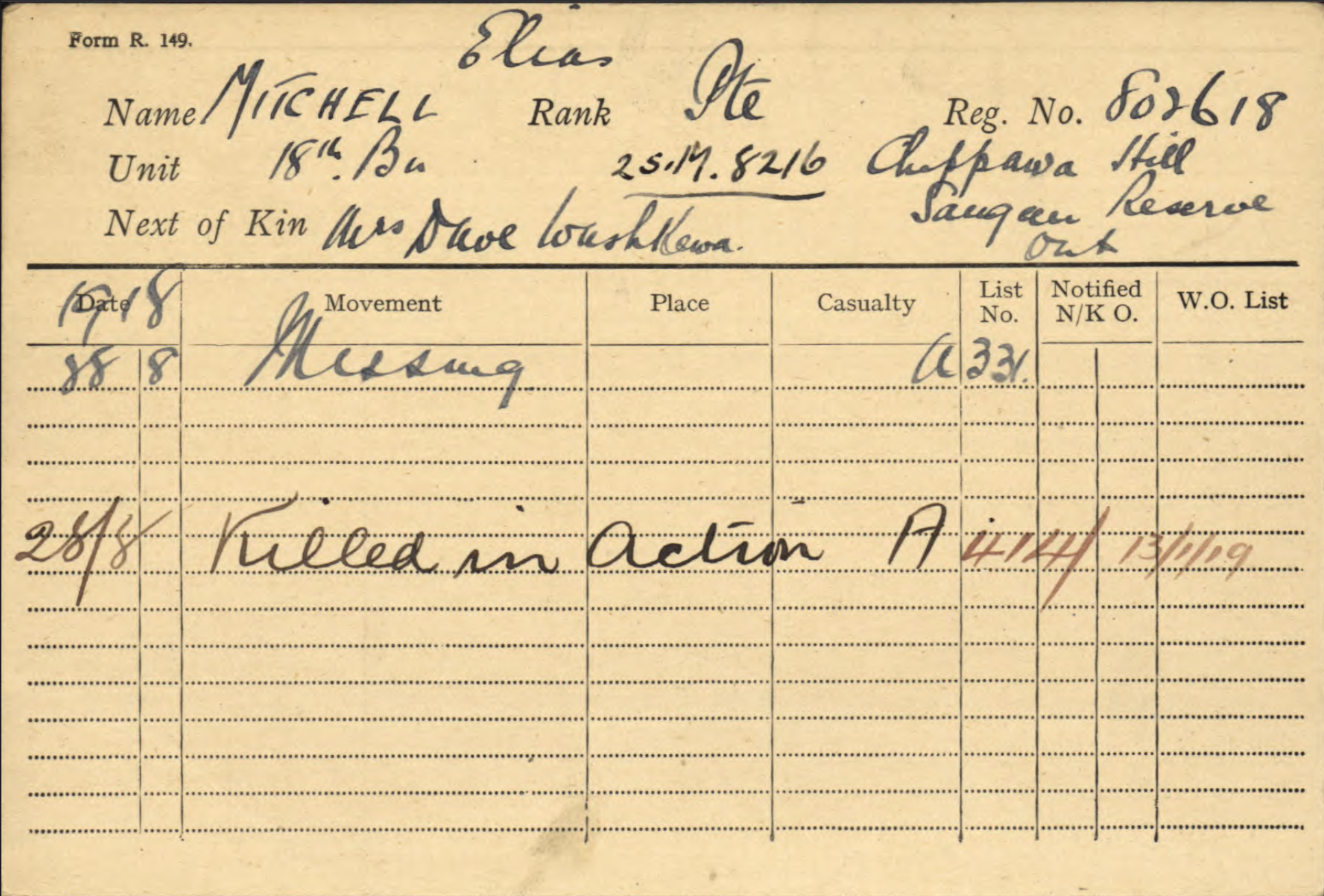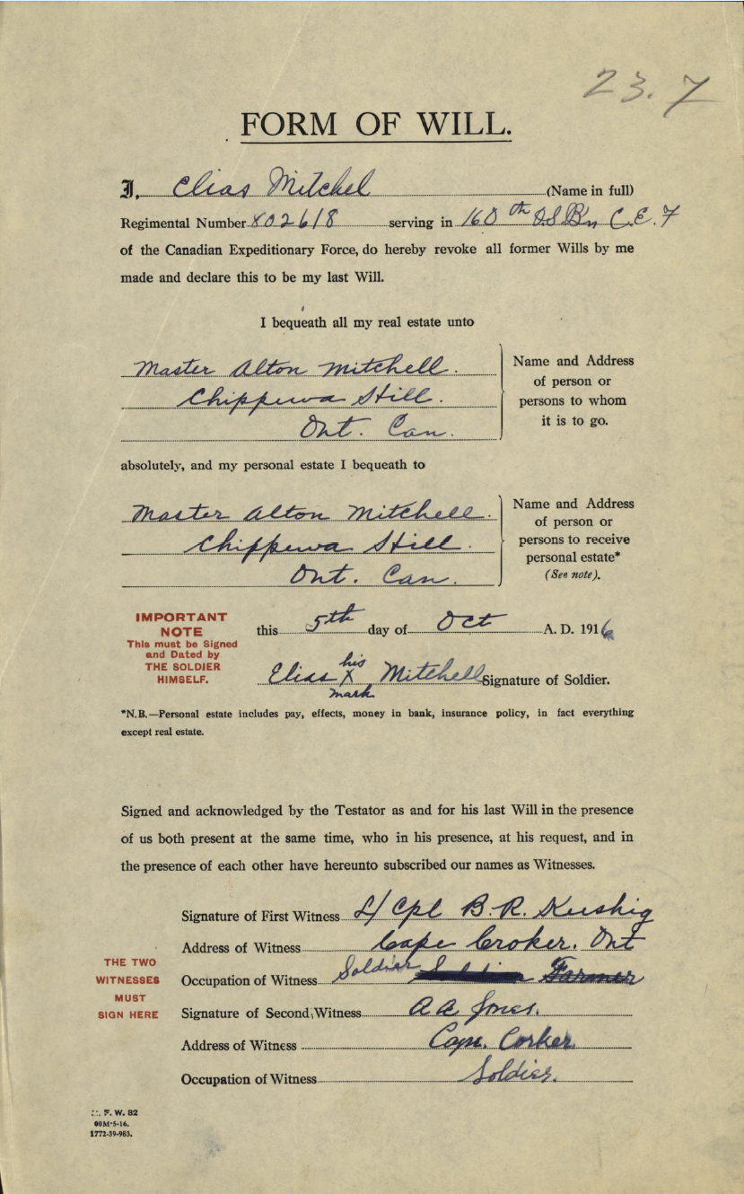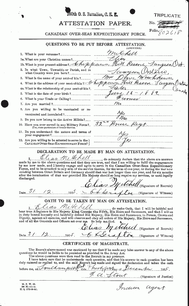 Family Search: Private Elias Mitchell was born on 16 June 1882, in Chippawa Hill, Saugeen 29, Bruce, Ontario, Canada as the son of John Mitchell and Betsey Mitchell. He married Nawash on 3 April 1911, in Saugeen, Bruce, Ontario, Canada. He registered for military service in 1915. In 1915, at the age of 33, his occupation is listed as farmer in Chippawa Hill, Saugeen 29, Bruce, Ontario, Canada. He died on 28 August 1918, in Vis-en-Artois, Pas-de-Calais, France, at the age of 36, and was buried in Wancourt, Pas-de-Calais, France.