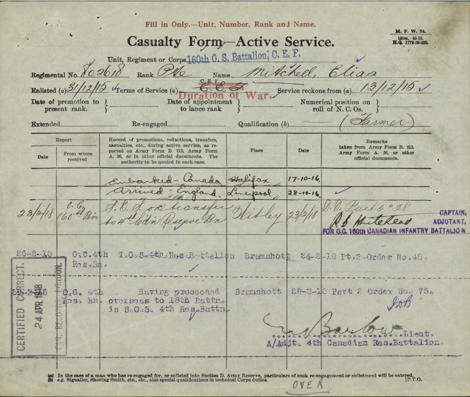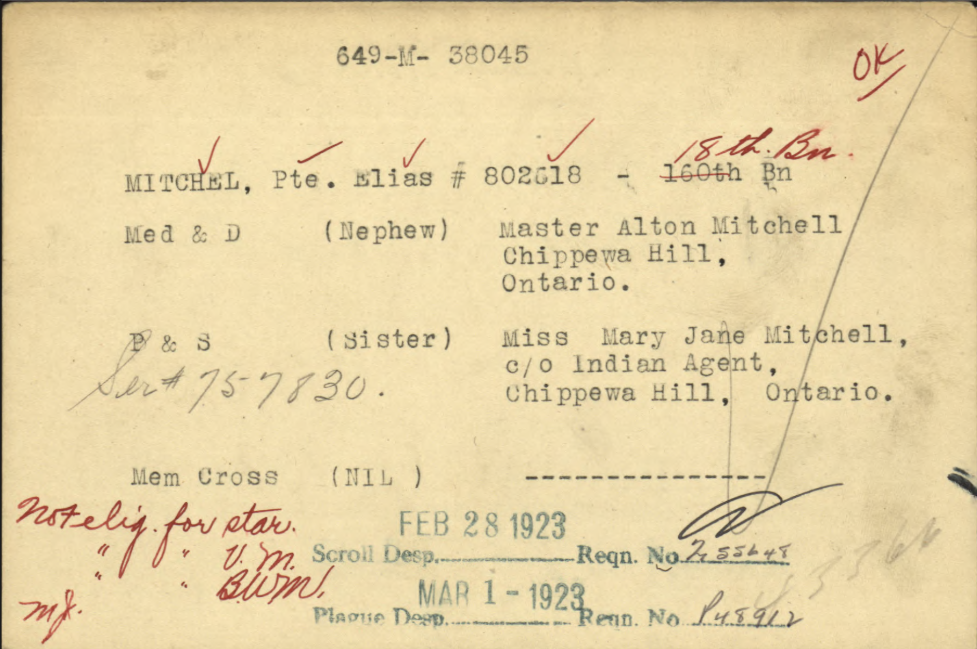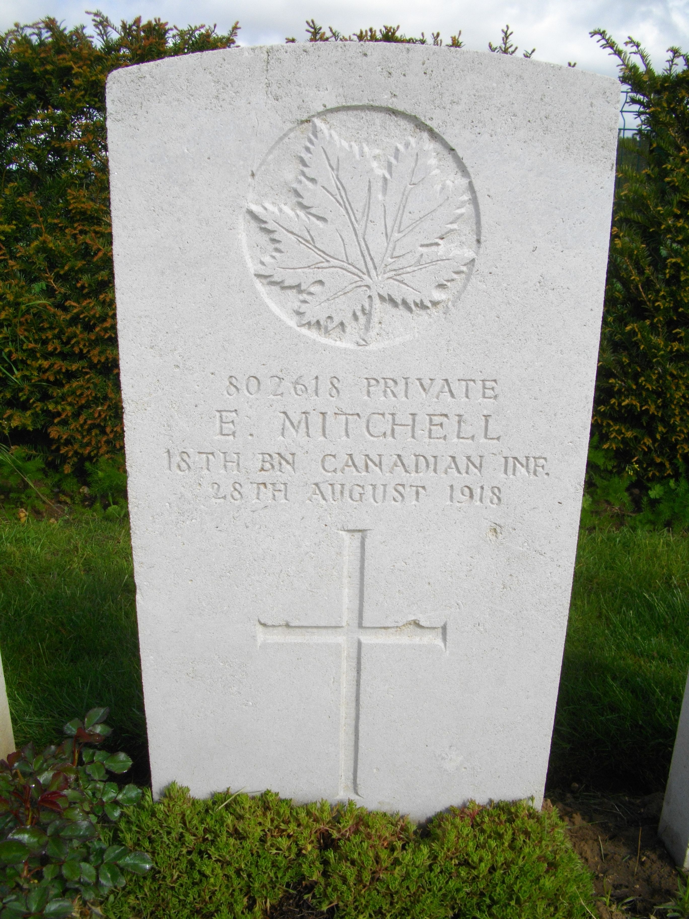 Family Search: Private Elias Mitchell was born on 16 June 1882, in Chippawa Hill, Saugeen 29, Bruce, Ontario, Canada as the son of John Mitchell and Betsey Mitchell. He married Nawash on 3 April 1911, in Saugeen, Bruce, Ontario, Canada. He registered for military service in 1915. In 1915, at the age of 33, his occupation is listed as farmer in Chippawa Hill, Saugeen 29, Bruce, Ontario, Canada. He died on 28 August 1918, in Vis-en-Artois, Pas-de-Calais, France, at the age of 36, and was buried in Wancourt, Pas-de-Calais, France.