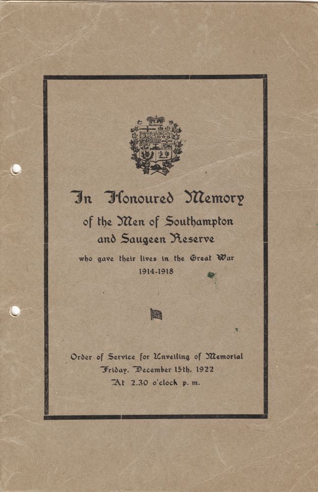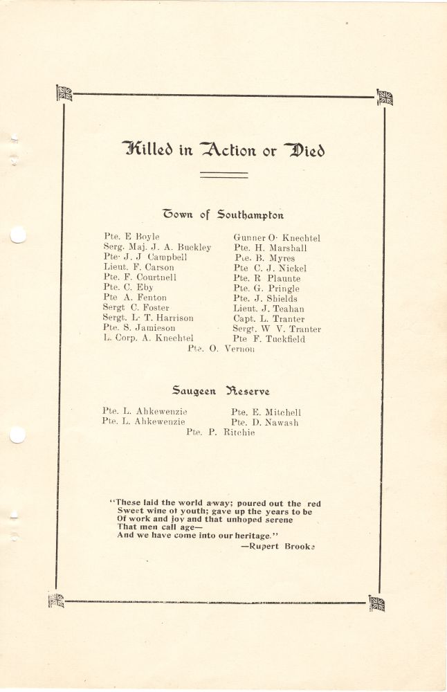 Southampton Cenotaph – Elias Mitchell was born on June 16th, 1882 on the Chippewa Hill Reserve (Saugeen Reserve), Bruce County, Ontario. He signed his Attestation papers to join the CEF on December 31st, 1915 at Southampton, Ontario, listing his prior occupation as a farmer. He indicated that prior to the war he had served in the 32nd Bruce Regiment. Elias Mitchell is remembered on the Southampton Cenotaph. This war memorial includes plaques with the names of men from World Wars 1 & 2. The WWI list is inscribed: “In grateful remembrance of the men of Southampton who fought and died in the Great War” and indicates which of the men were from the Saugeen Reserve (5 names). Two other men from Saugeen, Peter Ritchie and Daniel Nawash, died the day before Mitchell was killed, and were also with him in the 18th Battalion Western Ontario Regiment. Peter Ritchie and Elias Mitchell are both buried at Wancourt Cemetery, France. Southampton is in Bruce County, Ontario. The Saugeen Reserve is on the shore of Lake Huron and is home to the First Nation Chippewa of Saugeen. This photograph was taken by Mr. Clive Freeman in the summer of 2002. Via Canadian Virtual War Memorial.