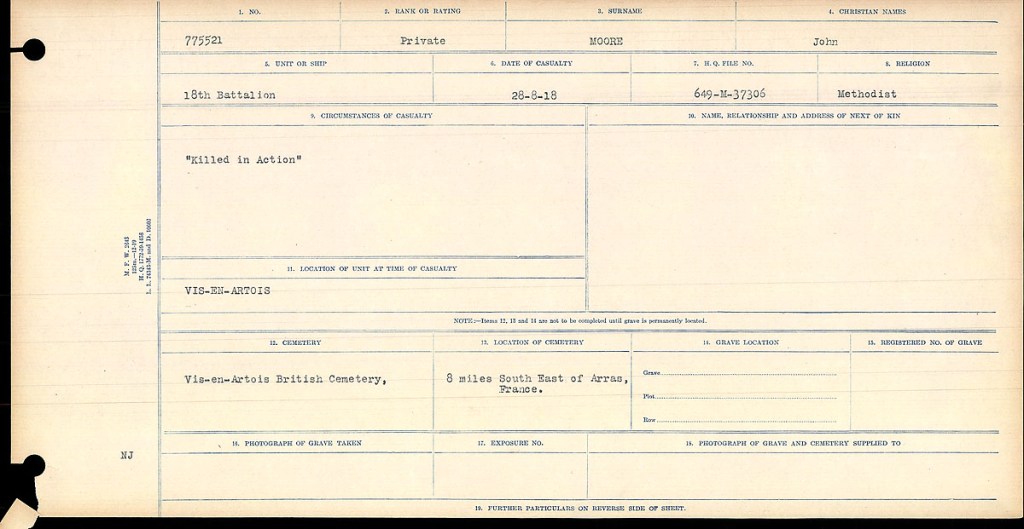 Family Search: When Private John Moore was born on 13 November 1894, in Malton, Toronto Township, Peel, Ontario, Canada, his father, John Moore, was 51 and his mother, Mary Elizabeth Short, was 41. He lived in Ontario, Canada in 1894 and Peel, Ontario, Canada in 1901. He registered for military service in 1915. In 1915, at the age of 21, his occupation is listed as farmer. He died on 28 August 1918, in Vis-en-Artois, Pas-de-Calais, France, at the age of 23, and was buried in Vis-en-Artois British Cemetery and Memorial, Haucourt, Pas-de-Calais, France.