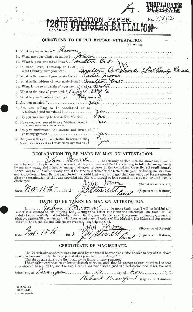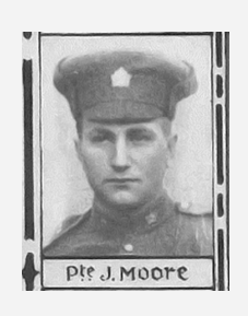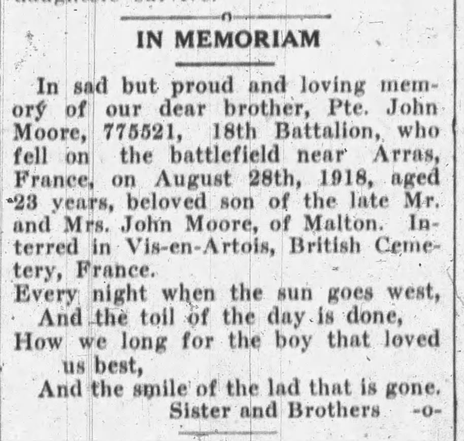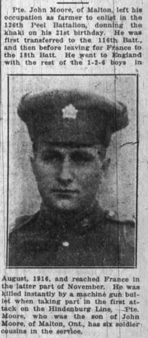 “Pte. John Moore, of Malton, left his occupation as farmer to enlist in the 126th Peel Battalion, donning the khaki on his 21st birthday. He was first transferred to the 116th Batt., and then before leaving for France to the 18th Batt. He went to England with the rest of the 1-2-6 boys in August, 1916, and reached France in the latter part of November. He was killed instantly by a machine gun bullet when taking part in the first attack on the Hindenburg Line. Pte. Moore, who was the son of John Moore, of Malton, Ont., has six soldier cousins in the service.”