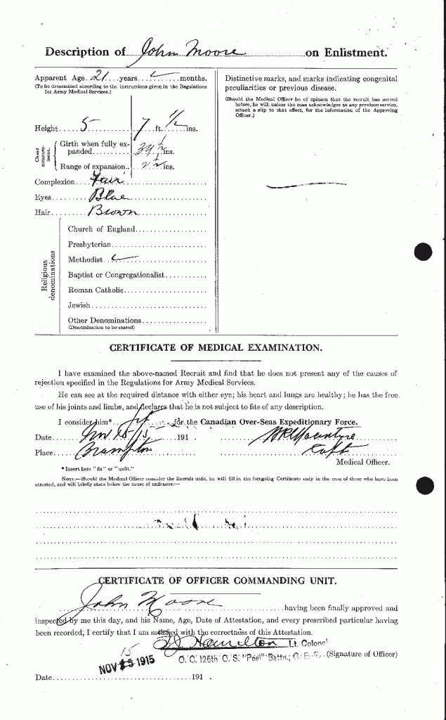 This man enlisted with the 126th Overseas Battalion at Brampton, Ontario, on 15 November 1918. He was a farmer by trade and had no prior military experience.