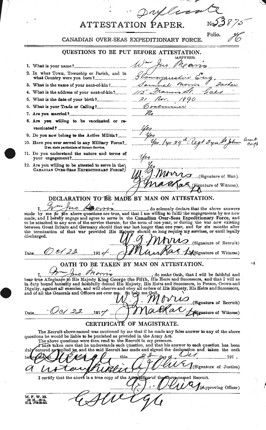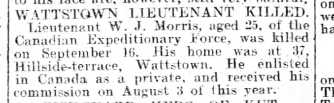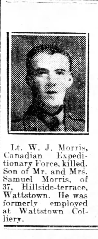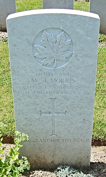 Family Search: Lieutenant William John Morris was born on 21 November 1890, in Glamorgan, Wales, United Kingdom as the son of Samuel Morris and Jane. He immigrated to Canada in 1914 and lived in Galt, Waterloo, Ontario, Canada in 1914. He registered for military service in 1914. In 1914, at the age of 24, his occupation is listed as coalminer. He died on 16 September 1916, in Courcelette, Somme, Hauts-de-France, France, at the age of 25, and was buried in Heilly, Somme, Picardie, France.