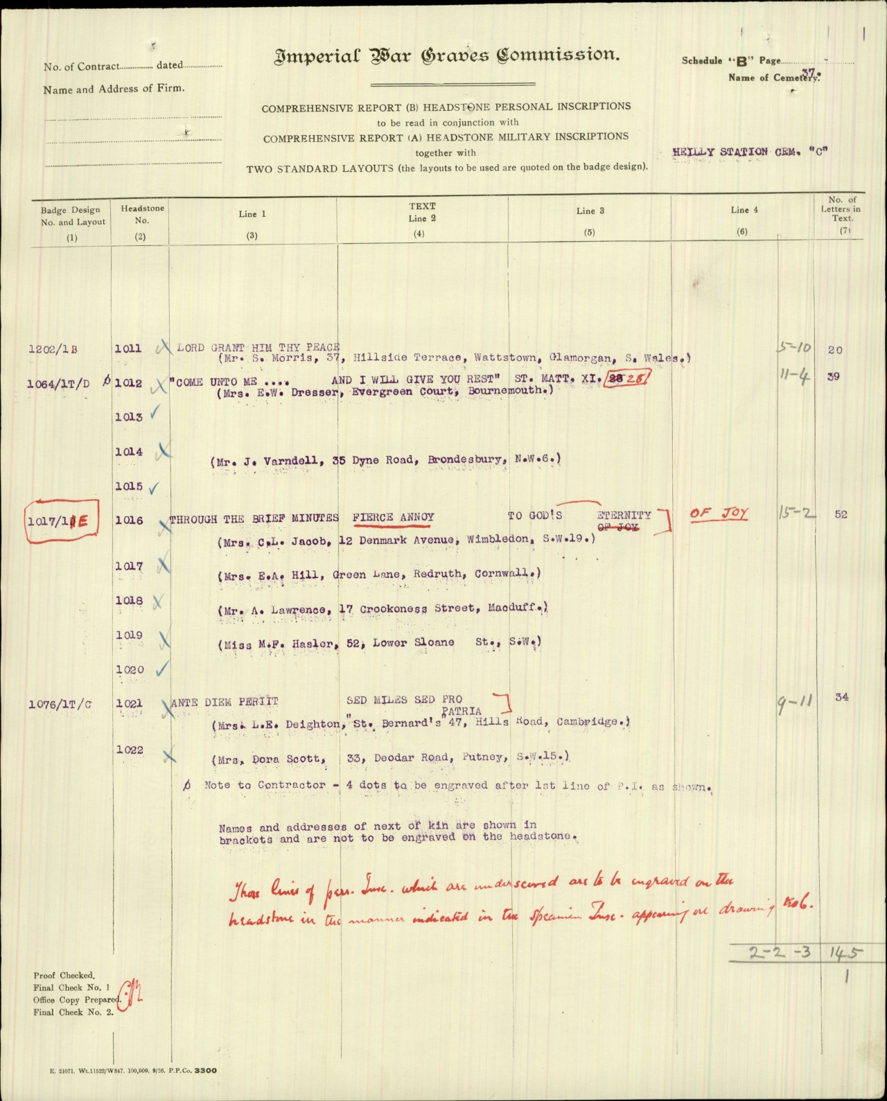 Whilst leading his company during operations on 15th September, 1916 and having reached the enemy’s front line he was wounded in the stomach by shrapnel. He was given immediate attention and taken to No. 30 Casualty Clearing Station where he died the next day.
