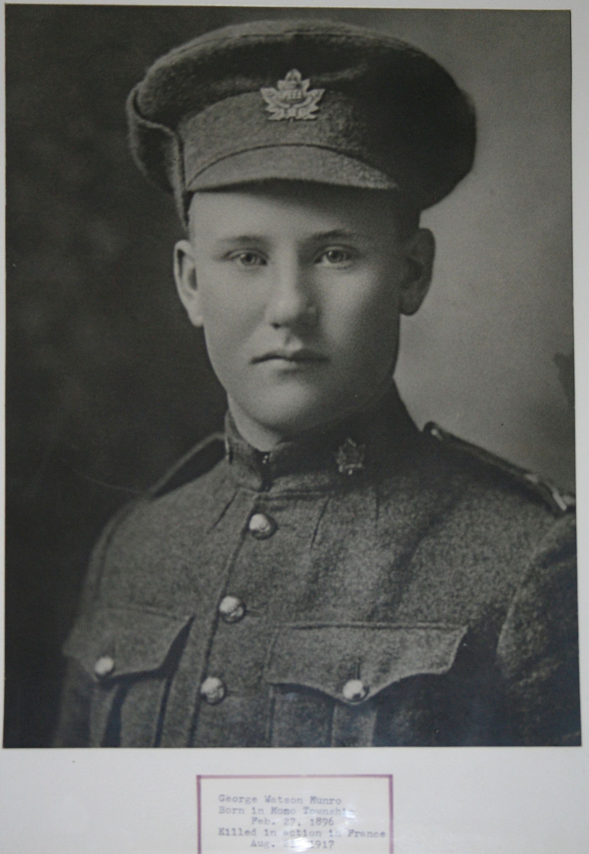 Family Search: When Private George Watson Munro was born on 27 February 1896, in Palgrave, Peel, Ontario, Canada, his father, Peter Munro, was 36 and his mother, Annie Innes Watson, was 35. He lived in Cardwell, Ontario, Canada in 1901 and Peel, Ontario, Canada in 1911. He registered for military service in 1916. In 1916, at the age of 20, his occupation is listed as farmer in Palgrave, Peel, Ontario, Canada. He died on 21 August 1917, in Lens, Pas-de-Calais, France, at the age of 21, and was buried in Aix-Noulette, Pas-de-Calais, France.