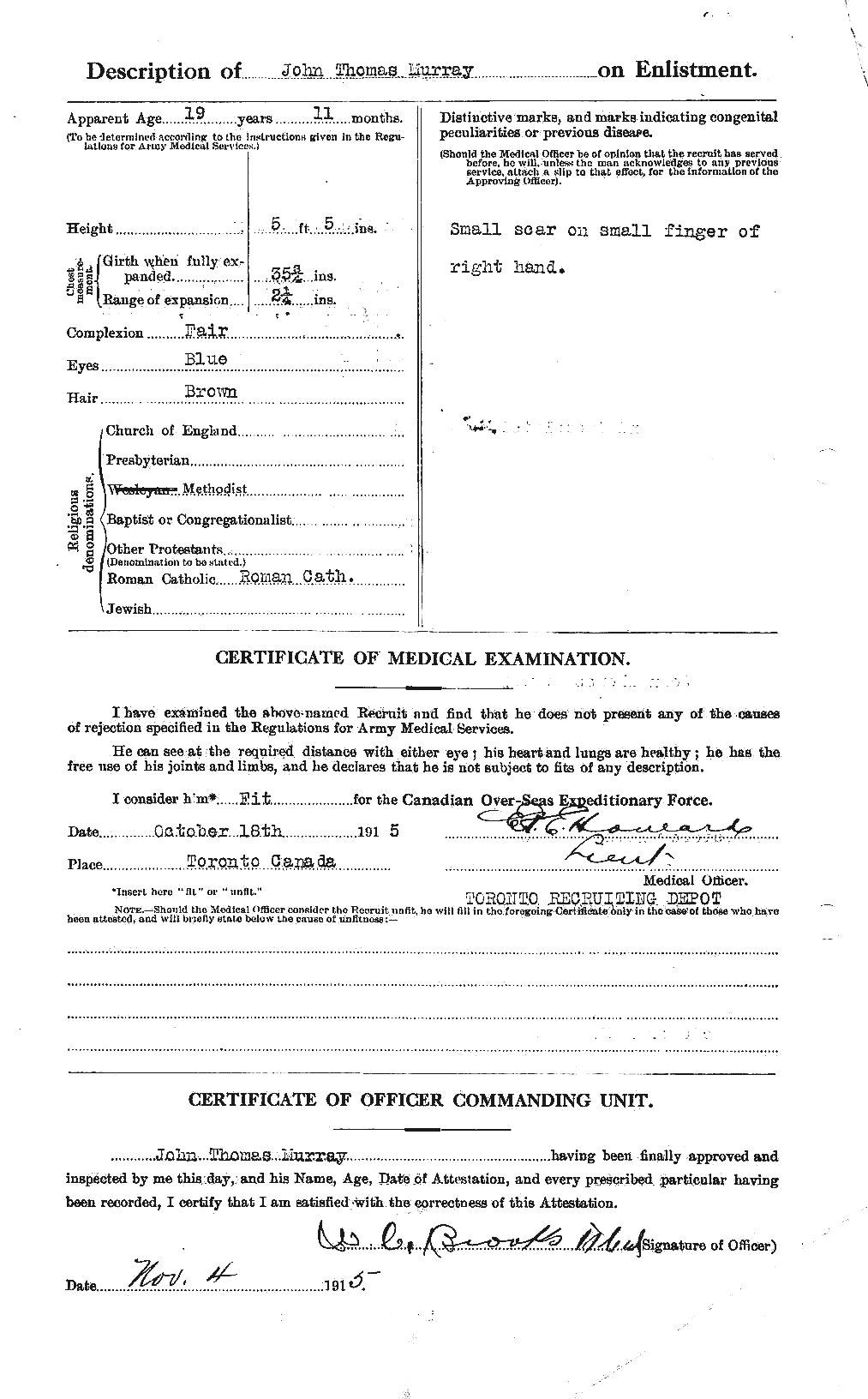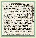 Pte. John Thomas Murray, a young Irishman, twenty-two years old, is reported killed in action on August 22nd. He arrived in this country nine years ago and was employed as a tinsmith by Messrs. MacDonald, Spadina Avenue. He boarded with Mrs. Blandford, 2 Cameron street. He and a fellow boarder, Pte. W. Wells, enlisted in a Mounted Rifles regiment about two years ago and went overseas in April 1916. Pte. Wells who was [?], returned with the draft from overseas last Friday. Mrs. Sinneard has two sons prisoners in Germany and her youngest son is still serving on the western front.
