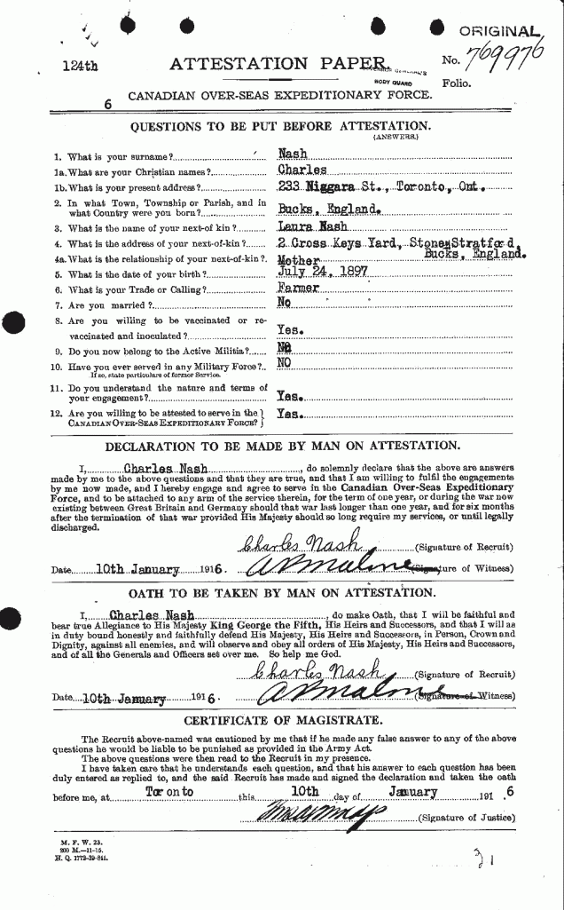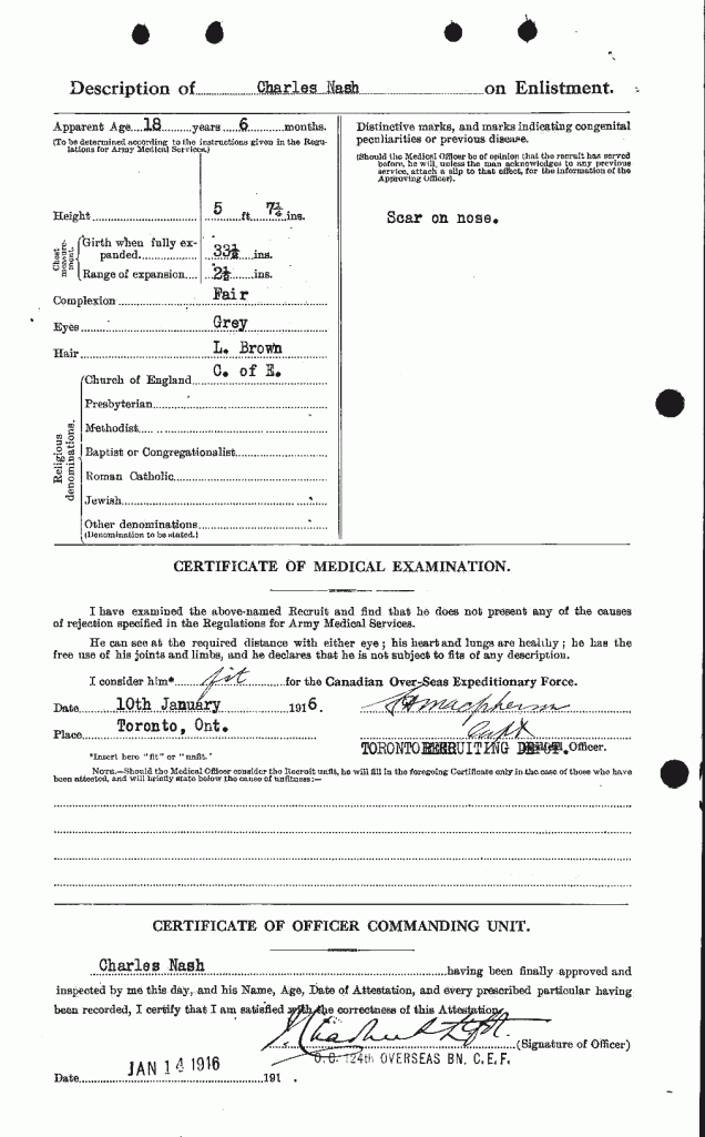 | January 10, 1916 | Enlisted | Enlisted at Toronto, Ontario with the 124th Battalion. He was a farmer that stood 5’7.25” tall. At 18-years, 6-months, his chest measured 33.5” with an expansion of 2.5”. He was considered fair with grey eyes and light brown hair. His next-of-kin was his mother, Laura Nash and she resided at 2 Cross Keys Yard, Stone, Stratford, Bucks, England. Private Nash resided at 233 Niagara Street, Toronto, Ontario when he enlisted. He had no prior military experience. He is 119 lbs. He is assigned to “B” Company, 124th Battalion. Changed his date of birth to July 24, 1897 making him under age. |