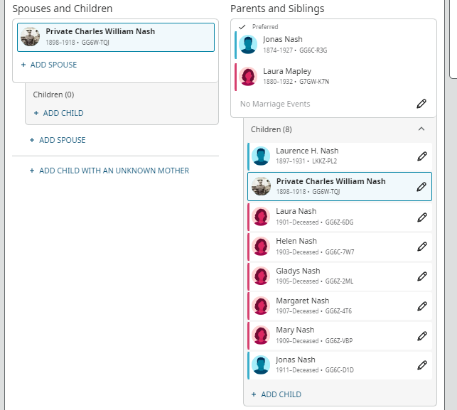 Family Search: When Private Charles William Nash was born on 24 July 1898, in Stantonbury, Buckinghamshire, England, United Kingdom, his father, Jonas Nash, was 24 and his mother, Laura Mapley, was 18. He immigrated to Canada in 1912 and lived in Toronto, Ontario, Canada in 1912 and Toronto, York, Ontario, Canada in 1916. He registered for military service in 1916. In 1916, at the age of 18, his occupation is listed as farmer in Toronto, York, Ontario, Canada. He died on 28 August 1918, in Vis-en-Artois, Pas-de-Calais, Nord-Pas-de-Calais, France, at the age of 20.