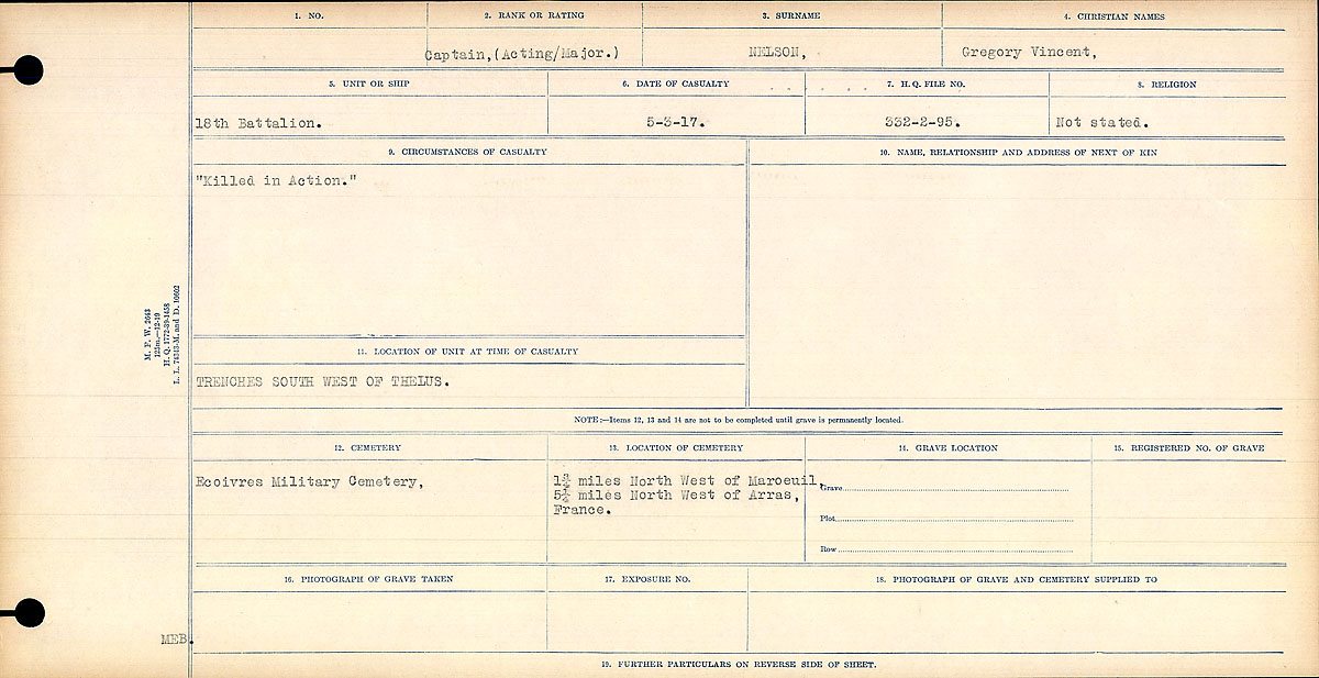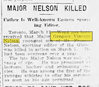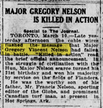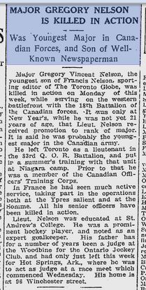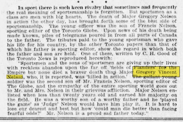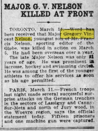 Major Gregory Vincent Nelson, the youngest son of Francis Nelson, sporting editor of the Toronto Globe, was killed in action Monday of this week while serving on the western battlefront with the 18th Battalion of the Canadian forces. It was only a New Years’s while he was not yet 21 years of age, that Lieut. Nelson received promotion to the rank of major. It is said he was probably the youngest major in the Canadian army.