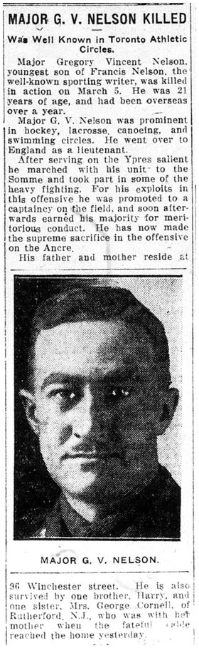 Word was received in Toronto yesterday that Major Gregory Vincent Nelson, youngest son of Mr. Francis Nelson, sporting editor of the Globe, had been killed in action on March 5. The late Major Nelson was just 21 years of age and had been overseas one year. Prominent in hockey, lacrosse, canoeing, and swimming circles, he was among the first to offer his services. He went to Niagara Camp in the spring of 1915, where he took his officers’ training with the late Major Charles W. Moss [Charles A. Moss] and other well-known Torontonians, and became attached to Col. Genet’s unit. When the drafts were asked for he stepped forwards as a volunteer and was sent overseas in charge of a number of men. He took further training at Shorncliffe, and was given special duty, but shortly attained his desire to get to France. He served at the Ypres salient, and at the Somme. For his exploits in the offensive he received his captaincy on the field, soon afterwards earned his majority. His death occurred at the Ancre.