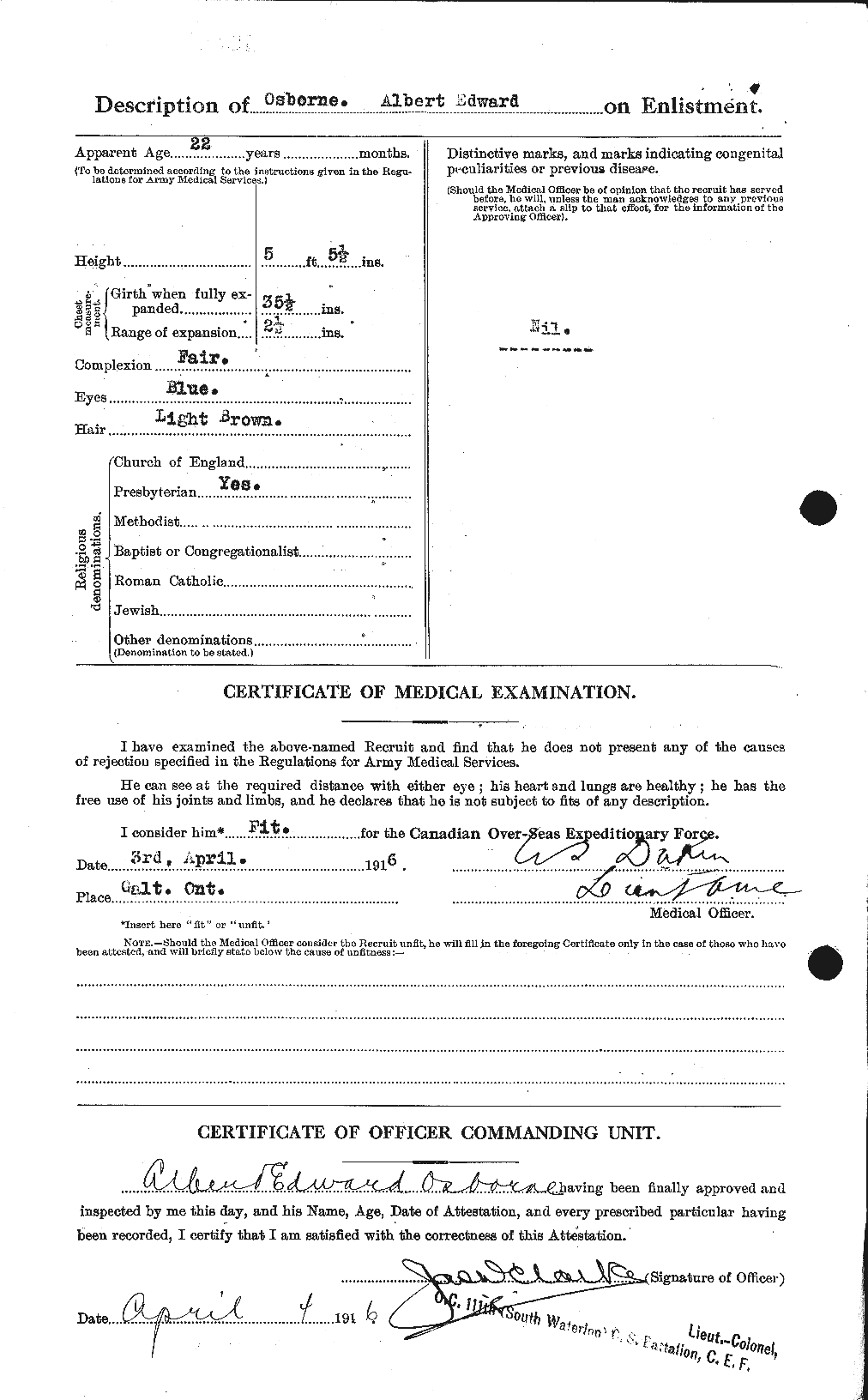 Family Search: Private Albert Edward Osborne was born on 25 October 1893, in Marylebone, London, England, United Kingdom. He immigrated to Canada in 1913 and lived in Branchton, Waterloo, Ontario, Canada in 1916. He registered for military service in 1916. In 1916, at the age of 23, his occupation is listed as farmer in Branchton, Waterloo, Ontario, Canada. He died on 11 November 1917, in Passendale, West Flanders, Belgium, at the age of 24, and was buried in Poperinge, West Flanders, Belgium.
