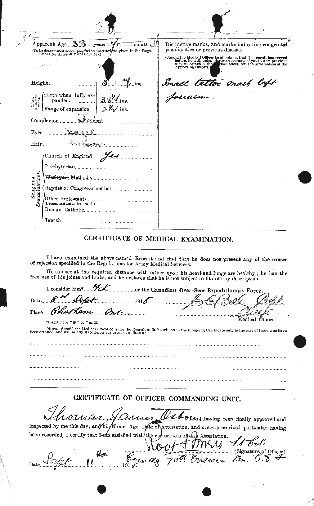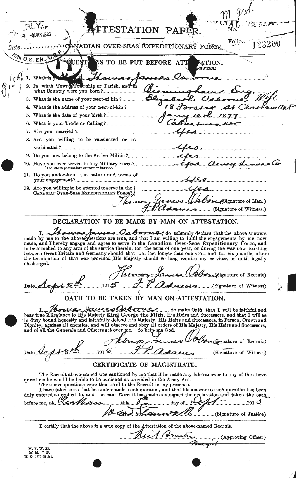 Family Search: When Private Thomas James Osborne was born on 16 January 1877, in Blackdown, Warwickshire, England, United Kingdom, his father, Thomas Osborne, was 15 and his mother, Ann Grant, was 16. He married Elizabeth Fanny Smythe on 11 September 1898, in London, England, United Kingdom. They were the parents of at least 4 sons and 2 daughters. He lived in Kent, Ontario, Canada in 1911 and Chatham, Kent, Ontario, Canada in 1915. He registered for military service in 1915. In 1915, at the age of 38, his occupation is listed as cabinent maker in Chatham, Kent, Ontario, Canada. He died on 3 October 1916, in Courcelette, Somme, France, at the age of 39, and was buried in Vimy, Pas-de-Calais, France.