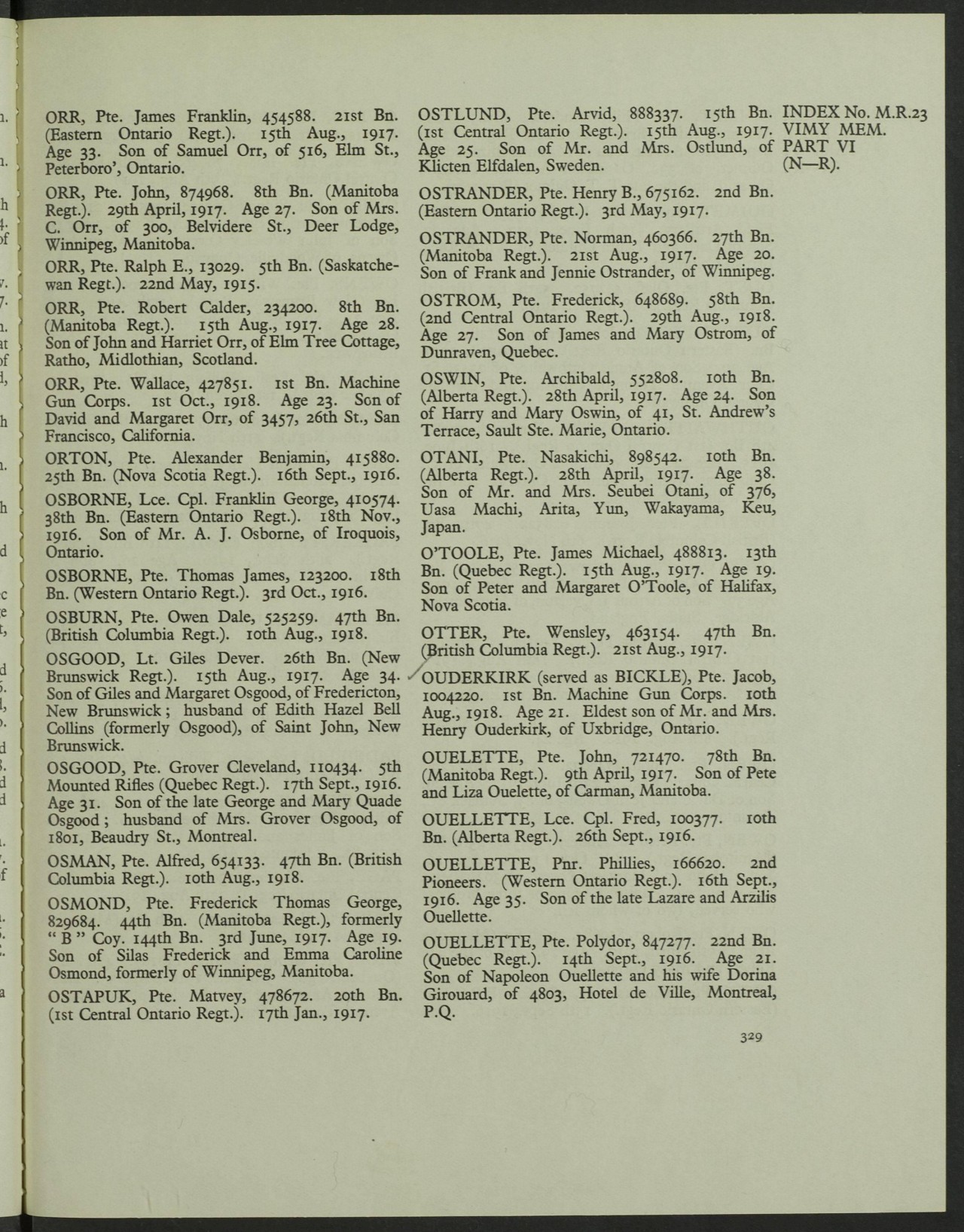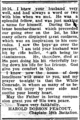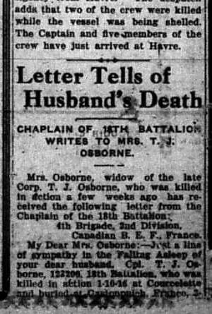 Letter from Thomas Osborne – This is believed to be Thomas James Osborne’s last letter before his death. Sept.1 (rec’d) Pt.T.J.Osborne #123200 10 Platoon C.Corps 18th Canadian 2nd Division, France Dear old Chum, Received your welcome letter yesterday and glad to hear from you. As you will note they let me revert to go to France when they tried in all ways to stop me so at last I am in it. Well Burt, I am with a London 18th one that has done good work so I am more content now. Sorry to say I cannot give you any news but it is…(missing text). Source: CVWM