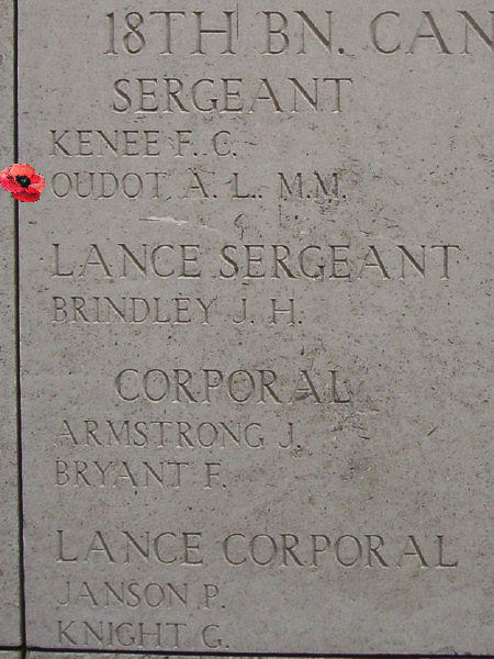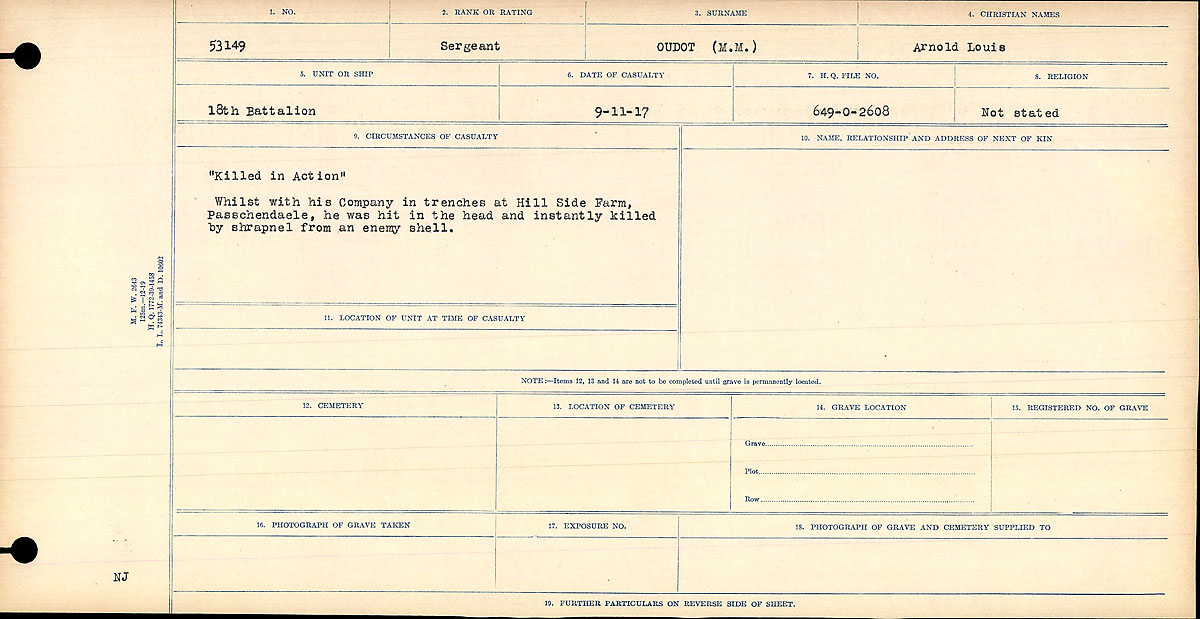 Family Search: Sergeant Arnold Lewis Oudot was born on 10 August 1888, in London, England, United Kingdom as the son of Adrien Leon Oudot and Johanna Oudot. He immigrated to Canada in 1914. He registered for military service in 1914. In 1914, at the age of 26, his occupation is listed as farmer. He died on 9 November 1917, in Passchendaele, West Flanders, Belgium, at the age of 29.