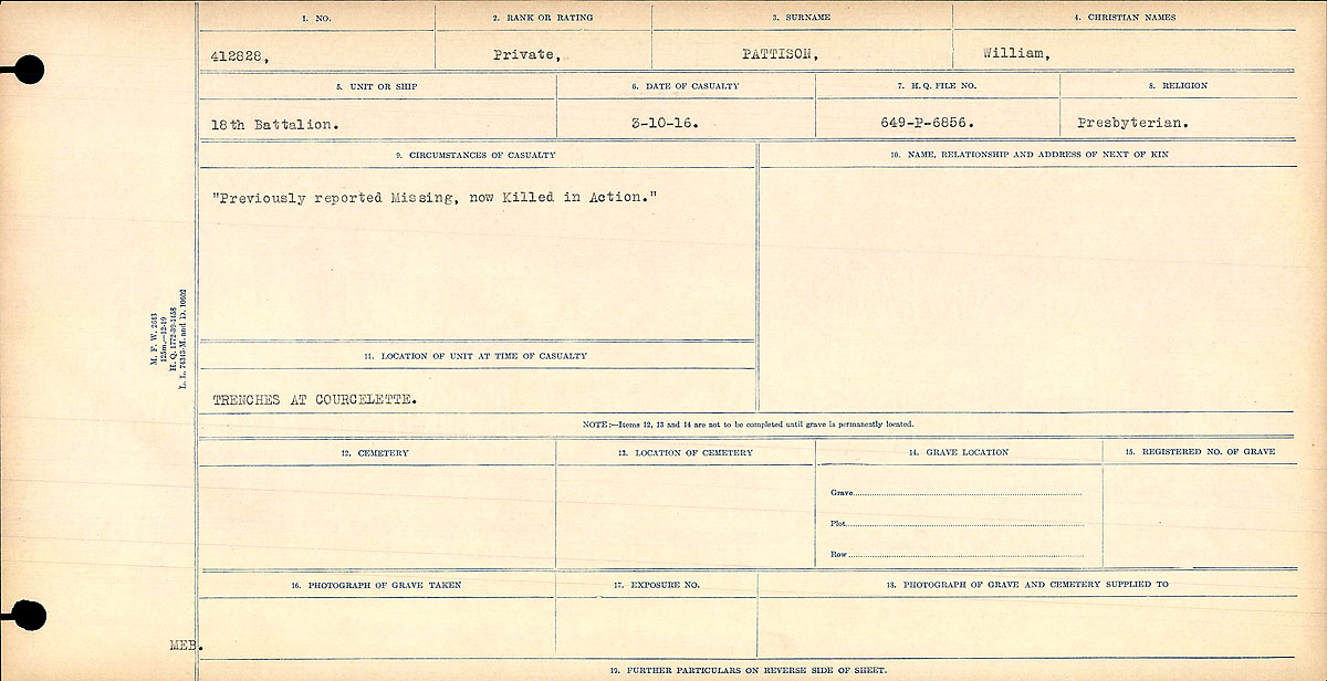 He recovered after being sent to other medical units, returning to the 18th Battalion on 19 September 1916 and served at the Somme until reported “Missing” on 3 October 1916. He was reported as being killed in action on that day with the notation in his service file dated 10 May 1917.