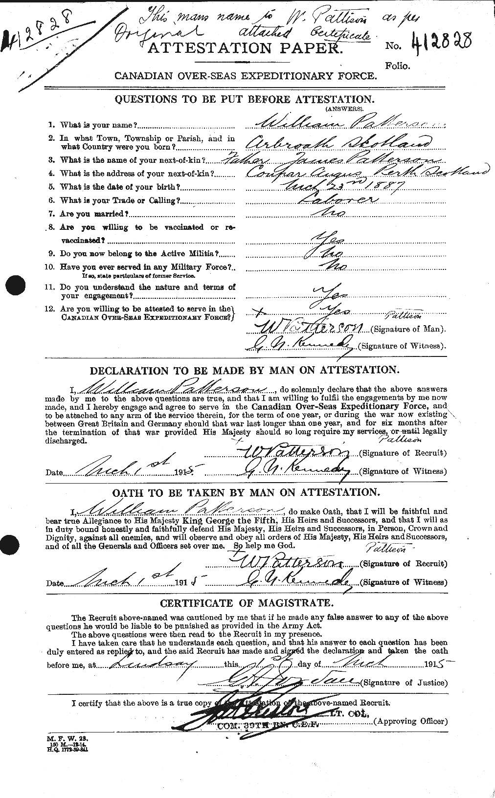 Note: Attestation papers have name written out as Patterson but a note at top of first page indicates the name is Pattison.