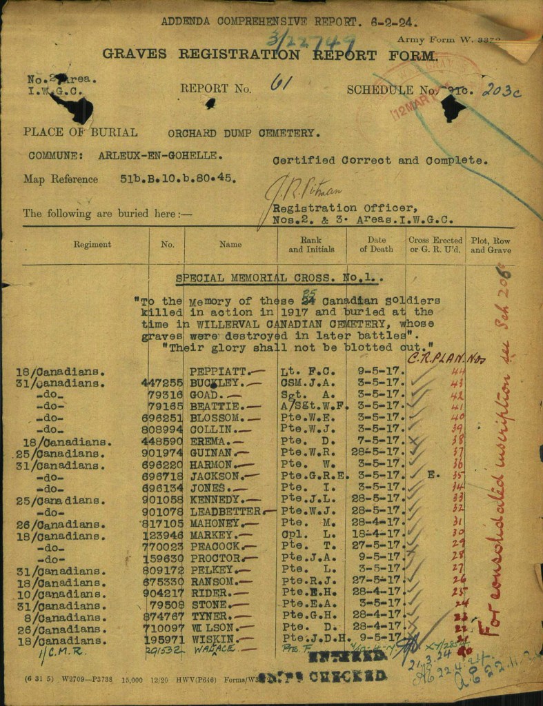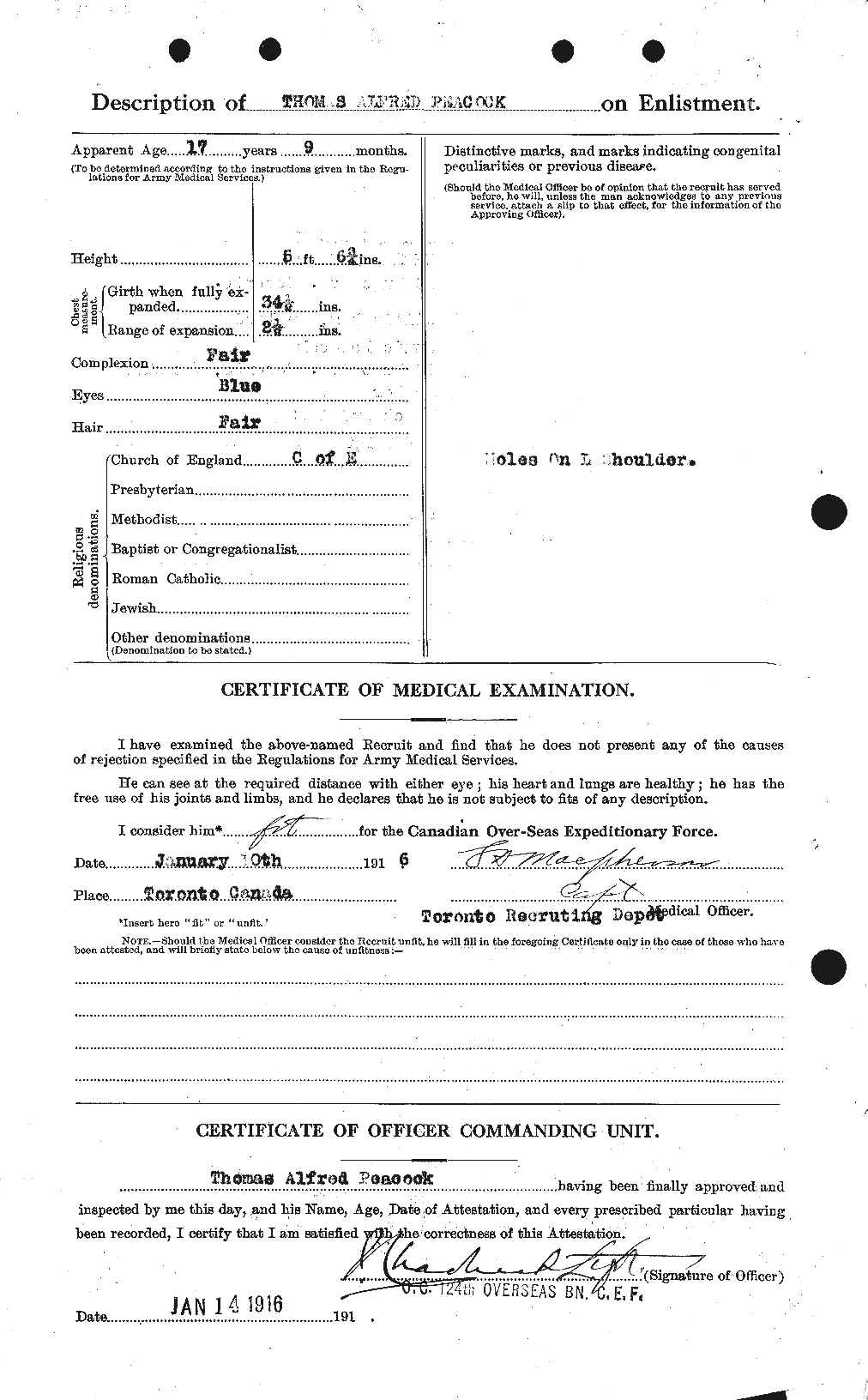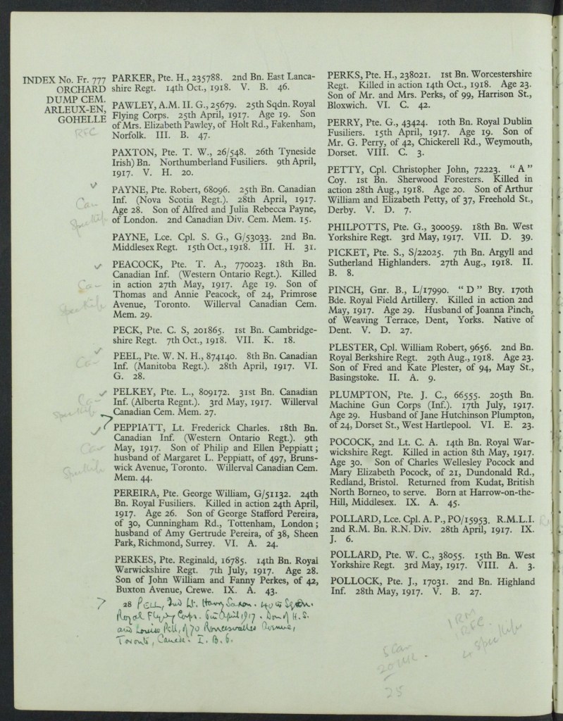 Family Search: Private Thomas Alfred Peocock was born on 2 March 1898, in Gillingham, Kent, England, United Kingdom as the son of Thomas Peacock and Annie Peacock. He immigrated to Canada in 1909 and lived in Toronto, York, Ontario, Canada in 1916. He registered for military service in 1916. In 1916, at the age of 18, his occupation is listed as machinist, Canada Foundry in Toronto, York, Ontario, Canada. He died on 27 May 1917, in Acheville, Pas-de-Calais, Nord-Pas-de-Calais, France, at the age of 19, and was buried in Arleux-en-Gohelle, Pas-de-Calais, Nord-Pas-de-Calais, France.