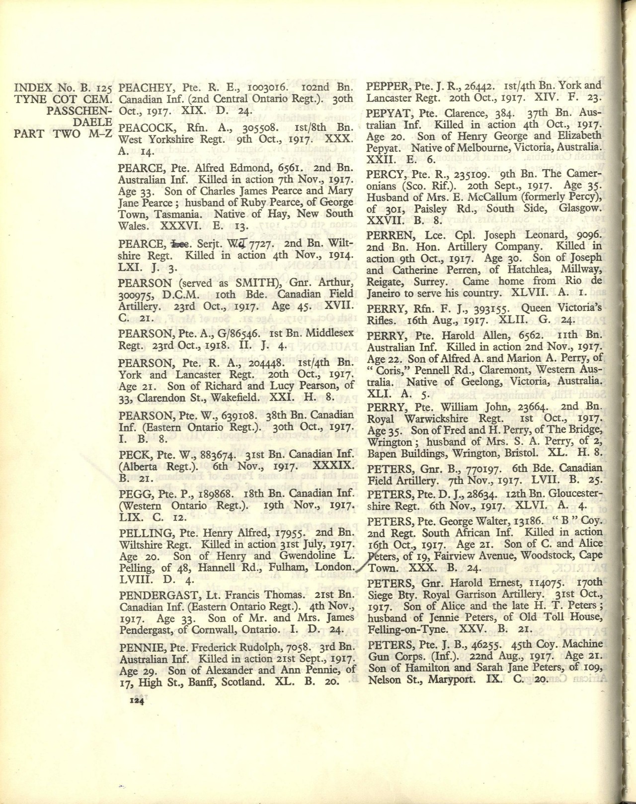Last week the following message was received by Mr. Peter PEGG concerning his son, about whose disappearance from the lines on Nov. 12th there appeared to be a great deal of mystery: “Deeply regret to inform you 189868 Pte. Peter PEGG, infantry, previously reported through German sources died, now officially reported died of wounds whilst a prisoner of war at Iseghem, Belgium, Nov 19, 1917. Just how Pte. PEGG fell into the hands of the enemy after he left the dressing station where he was traced to, is a mystery, but it is possible that he might have been dazed and wandered in the wrong direction. According to previous letters from the boys in the battalion he was not wounded seriously, so he must have suffered other wounds before he became a prisoner. Pete was one of the noblest of all the noble young soldiers who left Blenheim, and no one who knew him can have any doubt but that he fills a brave soldier’s grave. His grave was located in Belgium and later his body has been exhumed and buried in a British Cemetery, Tyne Cot near Ypres.