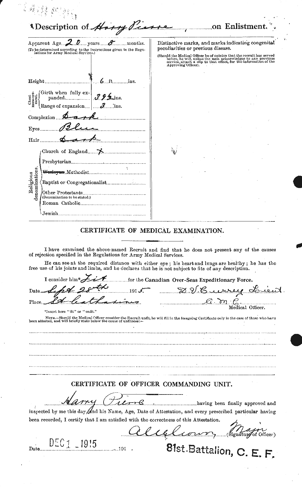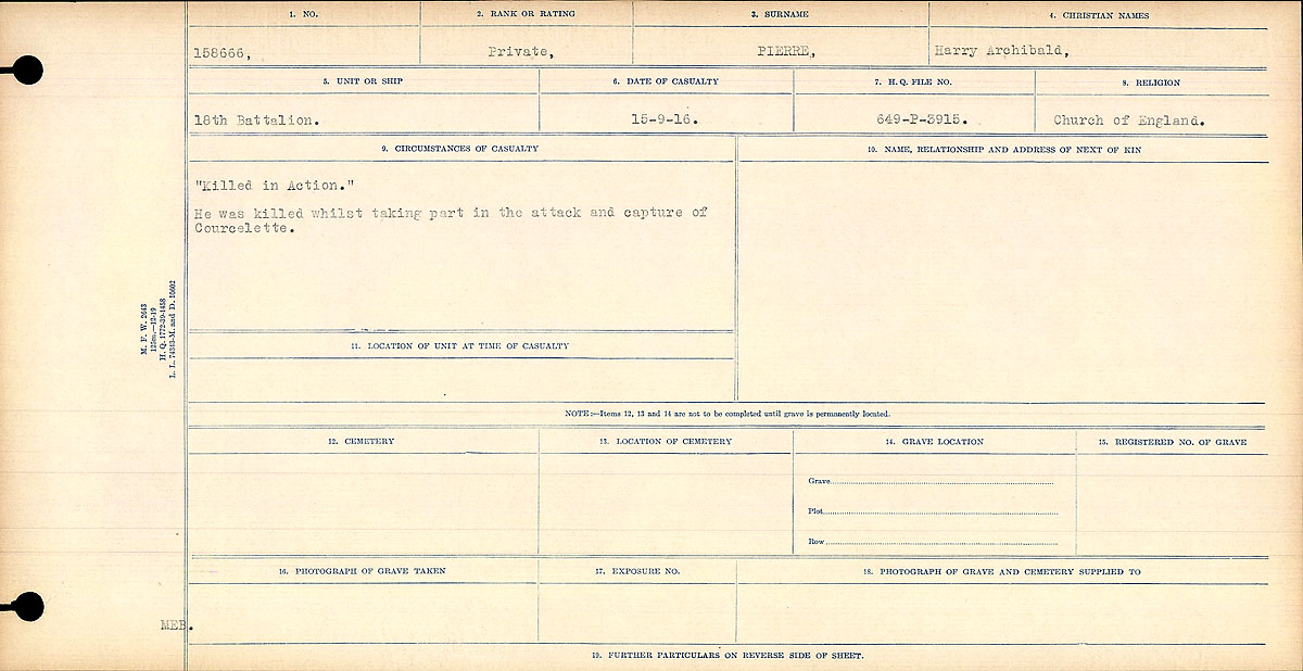 Son of Leon Alexandre Pierre, of 17, High St., West Tarring, Worthing, England, and the late Mary Elizabeth Pierre. Killed during the Battle of Flers-Courcelette where British tanks were first used. He stated he had previous service with the 19th (6 months) Medal collector has his Memorial Cross, other medals missing.