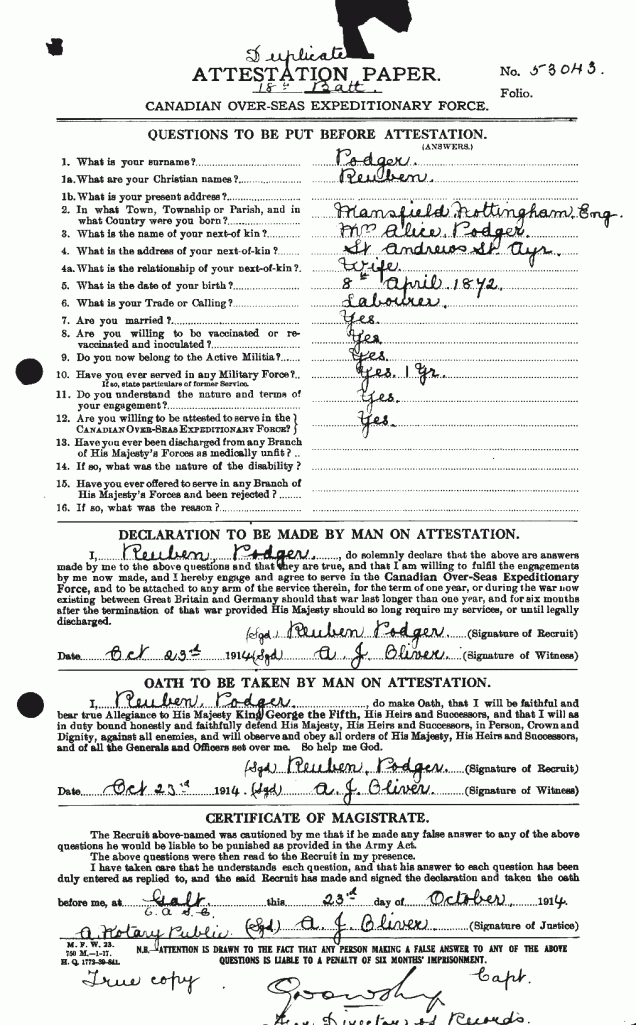 Family Search: When Private Reuben Podger was born on 8 April 1870, in Mansfield, Nottinghamshire, England, United Kingdom, his father, Robert Podger, was 31 and his mother, Charlotte Tucker, was 26. He had at least 5 sons and 2 daughters with Alice Mary Bartholomew. He lived in Waterloo, Ontario, Canada in 1911 and Ayr, Waterloo, Ontario, Canada in 1914. He registered for military service in 1914. In 1914, at the age of 44, his occupation is listed as labourer in Ayr, Waterloo, Ontario, Canada. He died on 17 November 1920, in Galt, Waterloo, Ontario, Canada, at the age of 50, and was buried in Mountview Cemetery, Galt, Waterloo, Ontario, Canada.