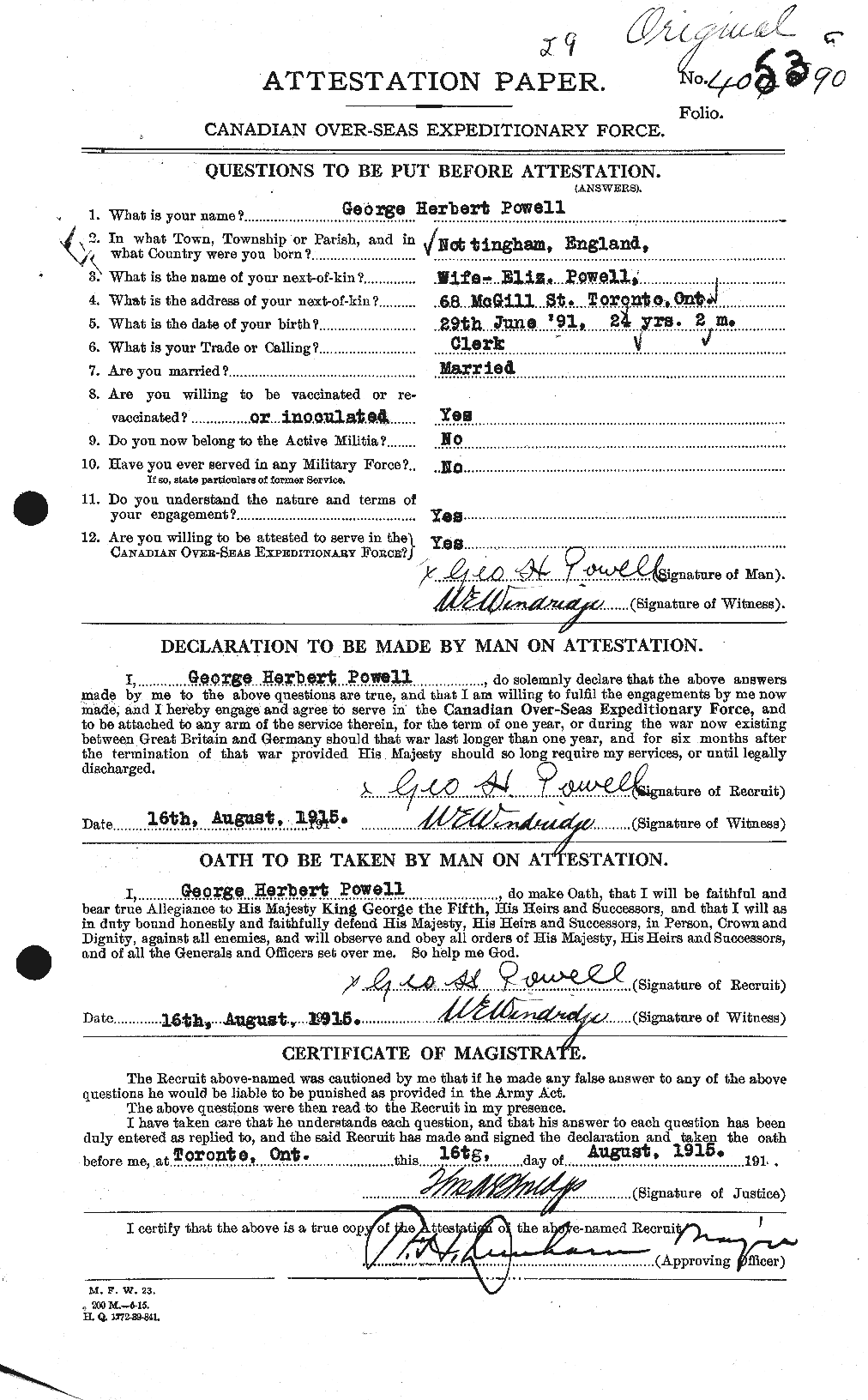 Family Search: When Private George Herbert Powell was born on 29 June 1891, in Nottingham, Nottinghamshire, England, United Kingdom, his father, Robert Powell, was 39 and his mother, Sarah Ann Brunt, was 33. He married Elizabeth May Yates on 4 March 1914, in Toronto, York, Ontario, Canada. They were the parents of at least 1 daughter. He immigrated to Canada in 1913 and lived in Toronto, York, Ontario, Canada in 1916. He registered for military service in 1916. His occupation is listed as clerk in Toronto, York, Ontario, Canada. He died on 12 April 1916, in Sint-Eloois-Winkel, West Flanders, Belgium, at the age of 24, and was buried in Voormezele, West Flanders, Belgium.