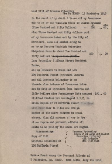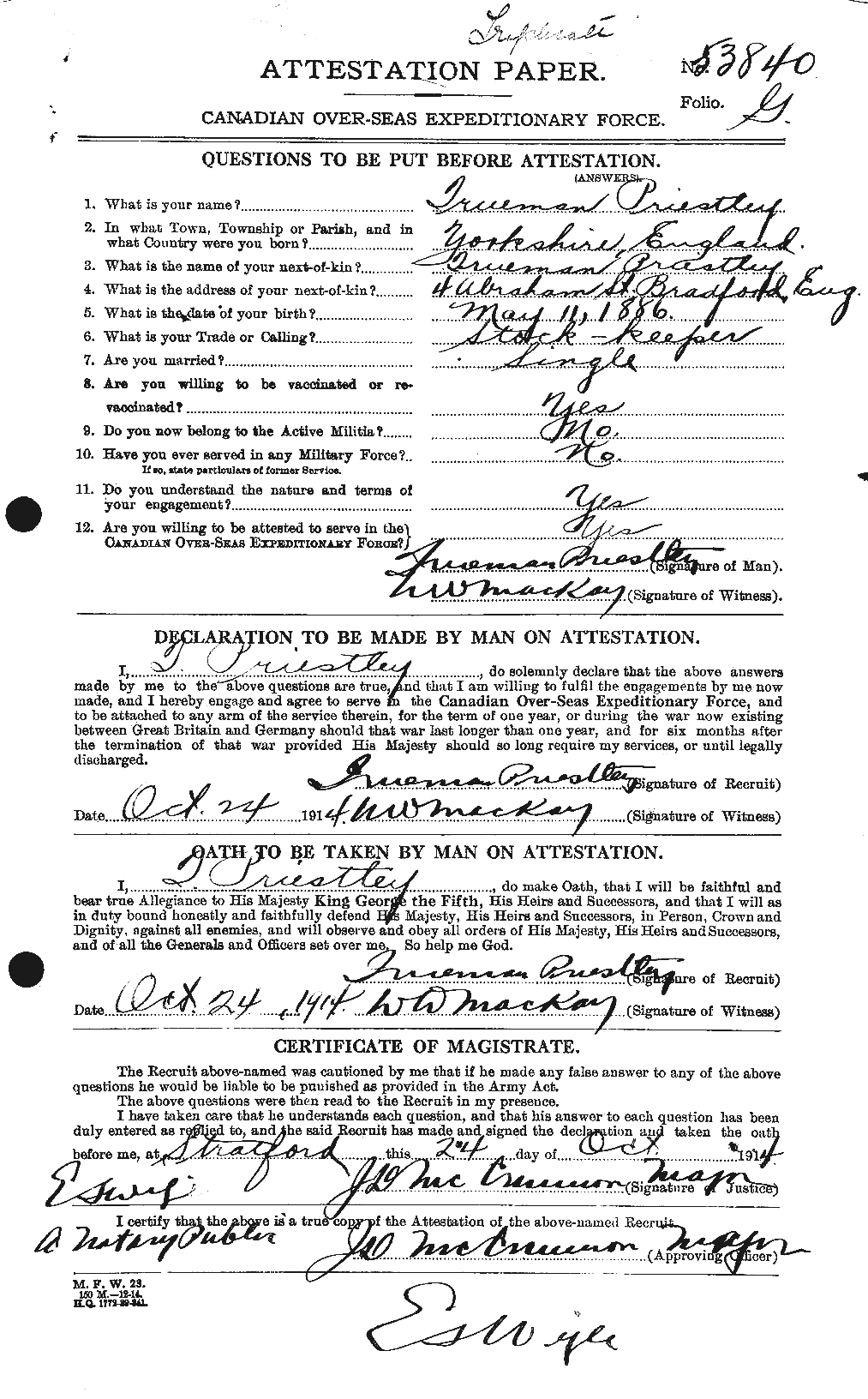 Family Search: Private Trueman Priestley was born on 11 May 1886, in Bradford, West Yorkshire, England, United Kingdom as the son of Sergeant Priestley and Lucy. He immigrated to Canada in 1913. He registered for military service in 1914. In 1915, at the age of 29, his occupation is listed as storekeeper. He died on 17 November 1915, in At Sea, at the age of 29, and was buried in At Sea.