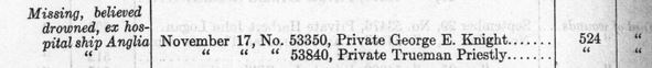 Source: Killed by drowning while being transported to England after being wounded in October 1915. Note that the Nominal Roll has this soldier under the name of Tineman Priestley.