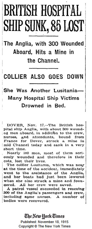 On November 17, 1915 the HMHS Anglia was sunk of Folkestone by a submerged mine lain by a German UC series of mine laying submarines. It was the 1st sinking of an Allied hospital ship from enemy action and 134 souls where lost.